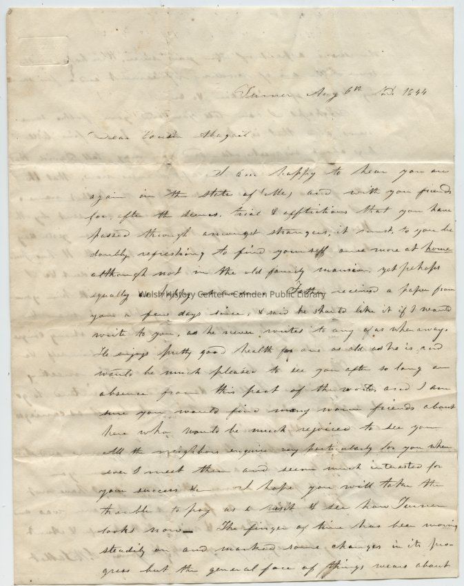 The fourth letter is addressed to "Cousin Abigail" in Goose River, Camden, Maine, in 1844, from [I.W.? Talbot] in Turner, Maine. This letter mentions that Abigail has recently moved back to Maine, and mentions a few other names, including David, Nathaniel, and Emery.