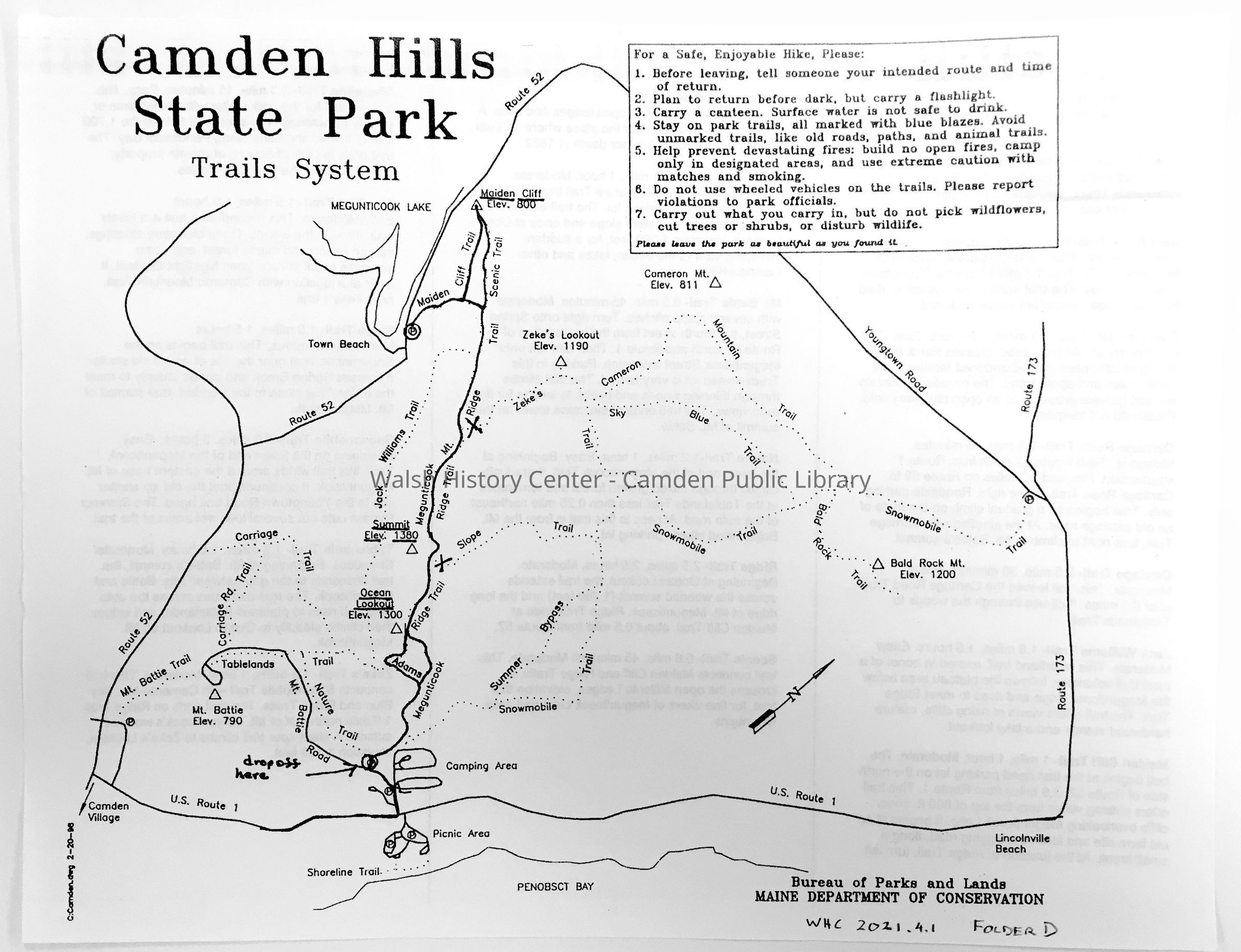 Camden Hills State Park Trails system by Maine Department of Conservation, Bureau of Parks and Lands. Map and 2-page description. 3-page photocopy of brochure, donated by Steve Sullivan. Undated.Collection