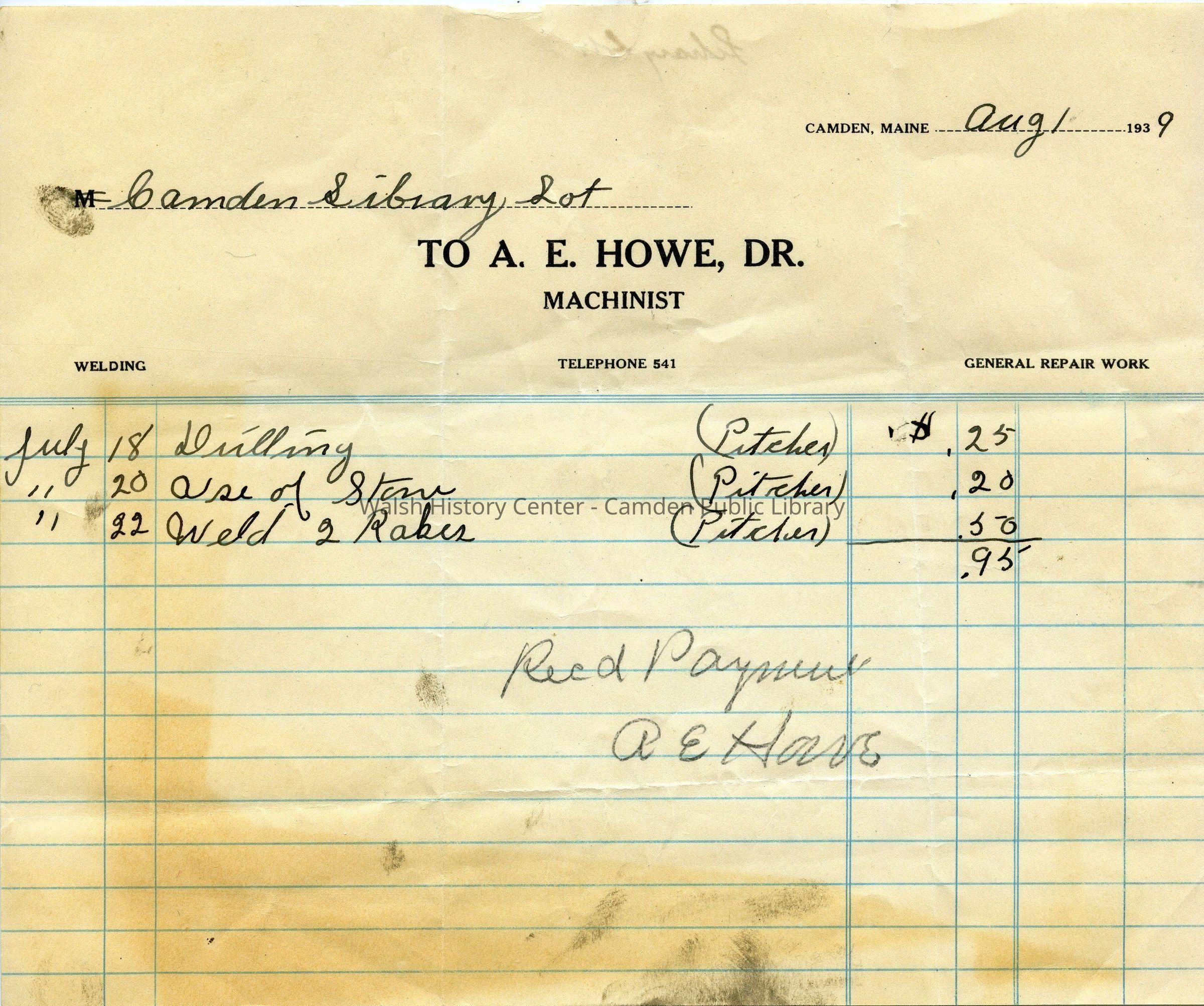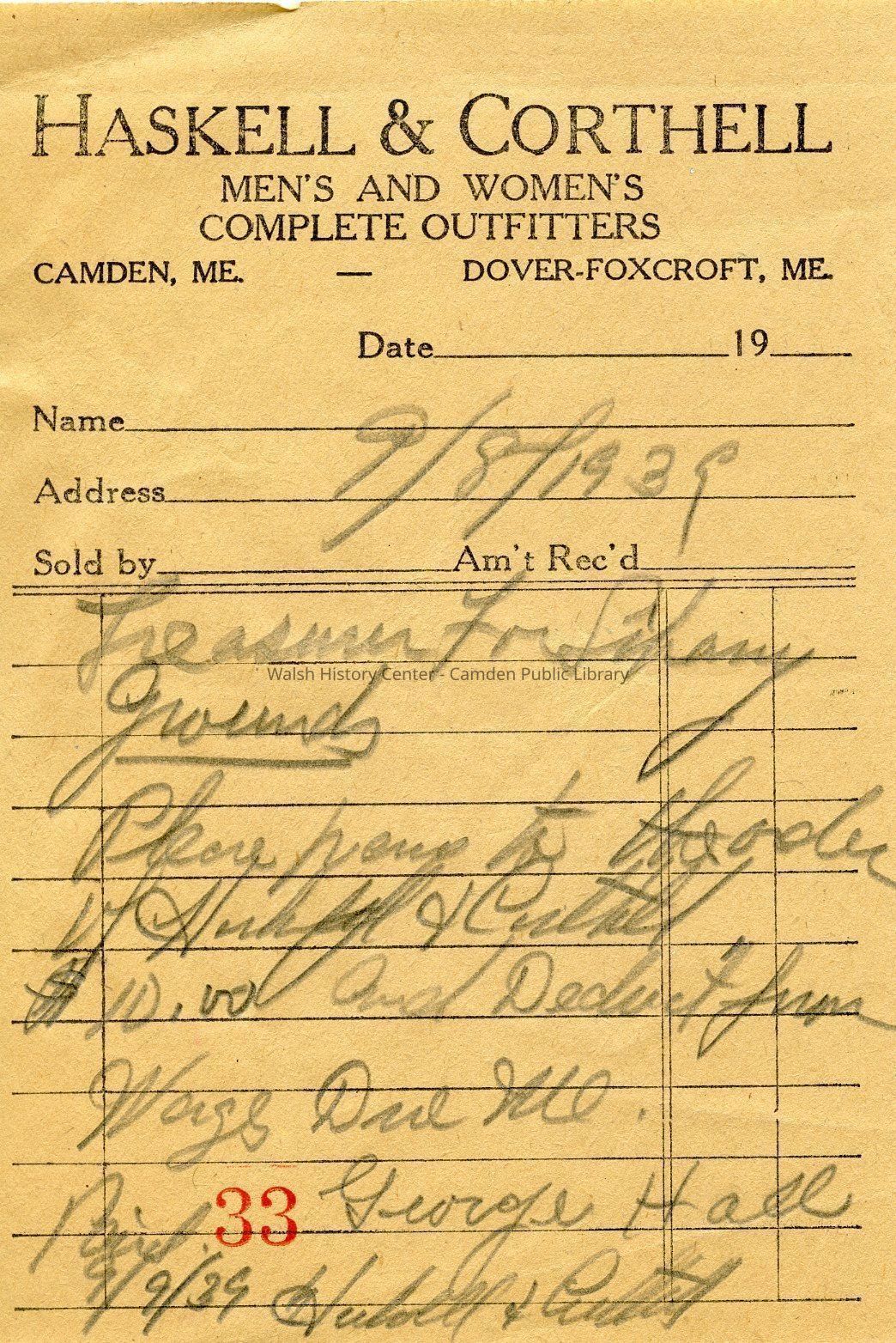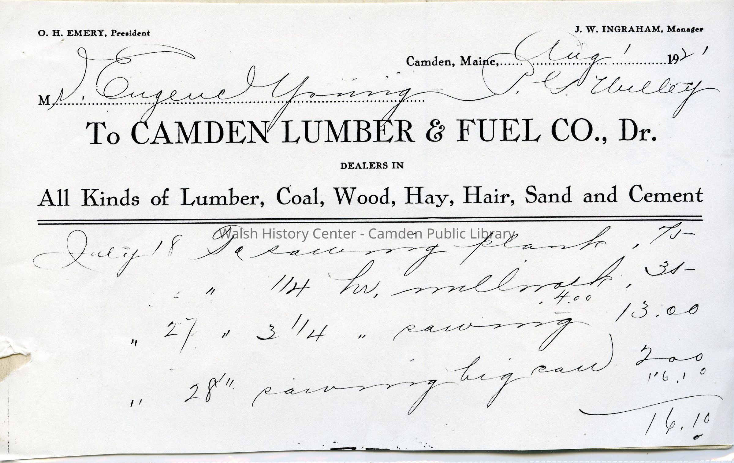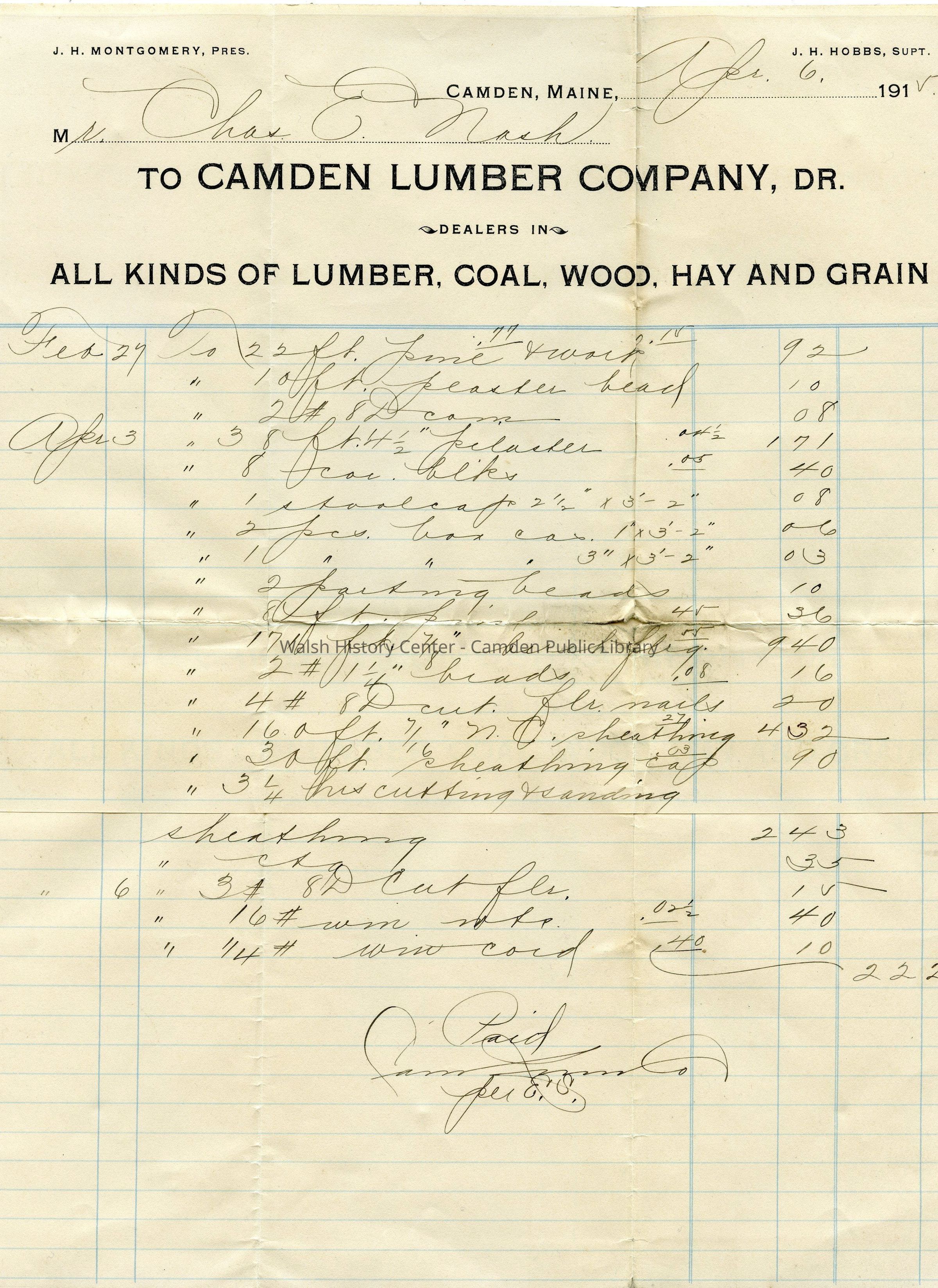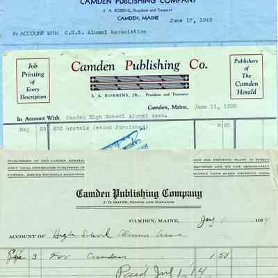 Contains billheads, stationery, bills, letterheads, and receipts from several Camden area businesses. These items date from the 1880's through the 1950's. Partial list of businesses represented: G.W. Achorn; Allen Insurance Agency; Ayers Market; Bay View House; Bay View Street Garage; Boynton's Pharmacy; Brown & Hobbs lumber; Brown's Market; Camden Anchor-Rockland Machine Co.; Camden & Rockland Water Company; Camden Farmer's Union; Camden Lumber Company; Camden Publishing Company; Camden Yacht Building and Railway Company; Carleton, Pascal & Co.; J.C. Curtis Hardware; Follansbee & Wood; Haskell & Corthell; J.H. Hobbs Company; Lenfest's Automotive Service; J.L. Locke; Maiden Cliff Rebekah Lodge; Maine Insane Hospital; The Megunticook Press; A.H. Parsons; Pendleton Dairy; S.G. Ritterbush, contractor; Rockland, Thomaston & Camden Street Railway; S.E. & H.L. Shepherd Company; TalbotArchive Details