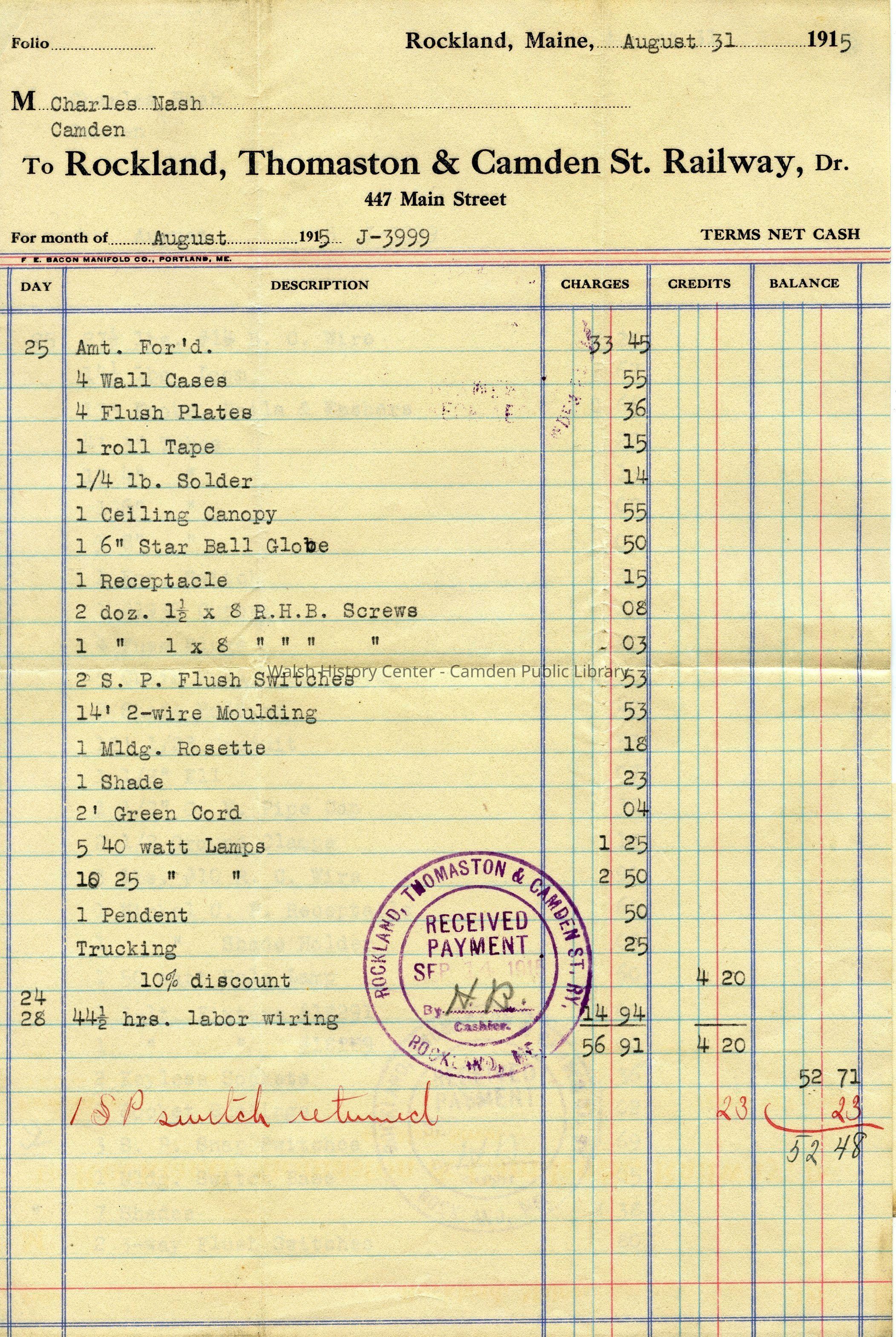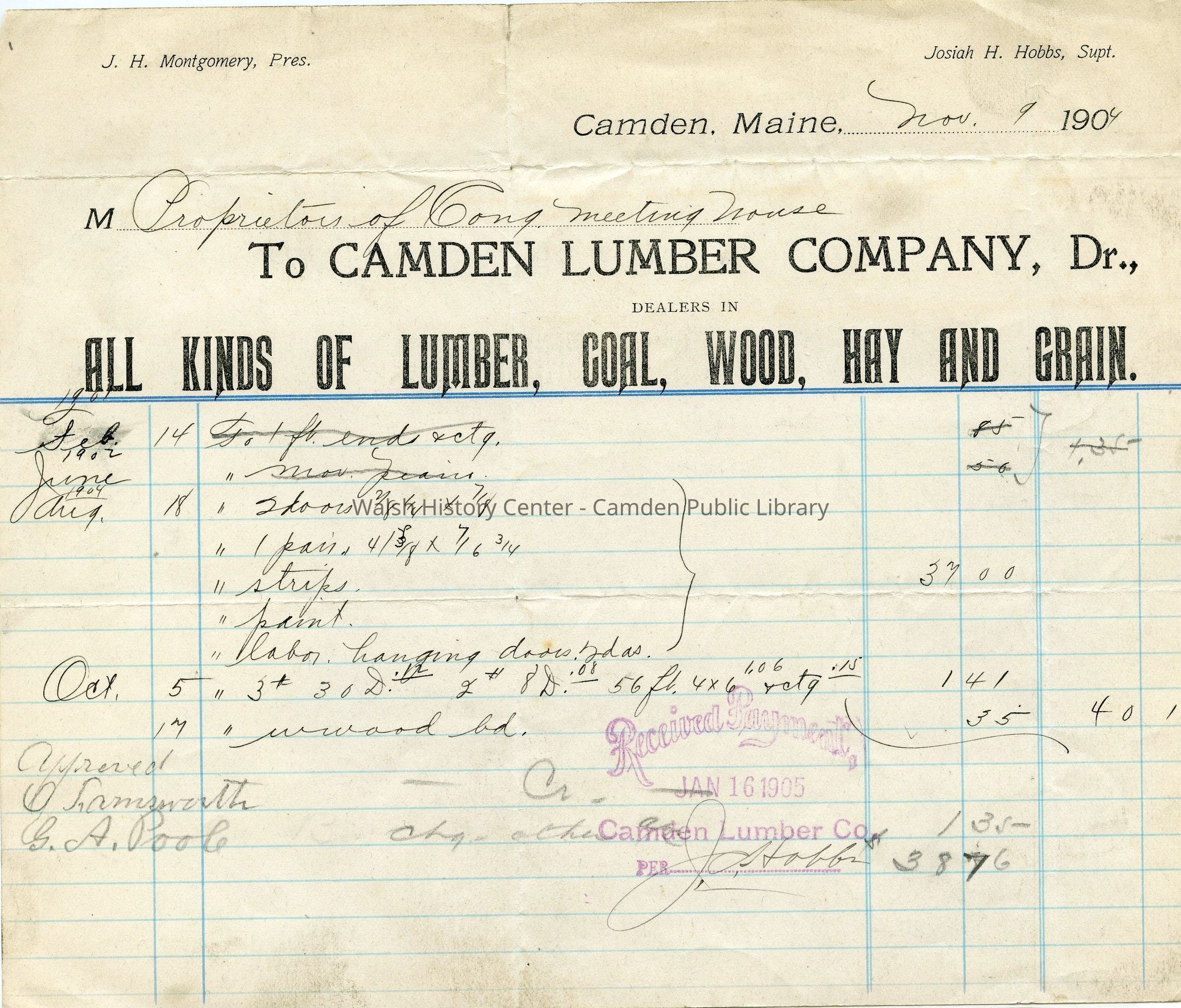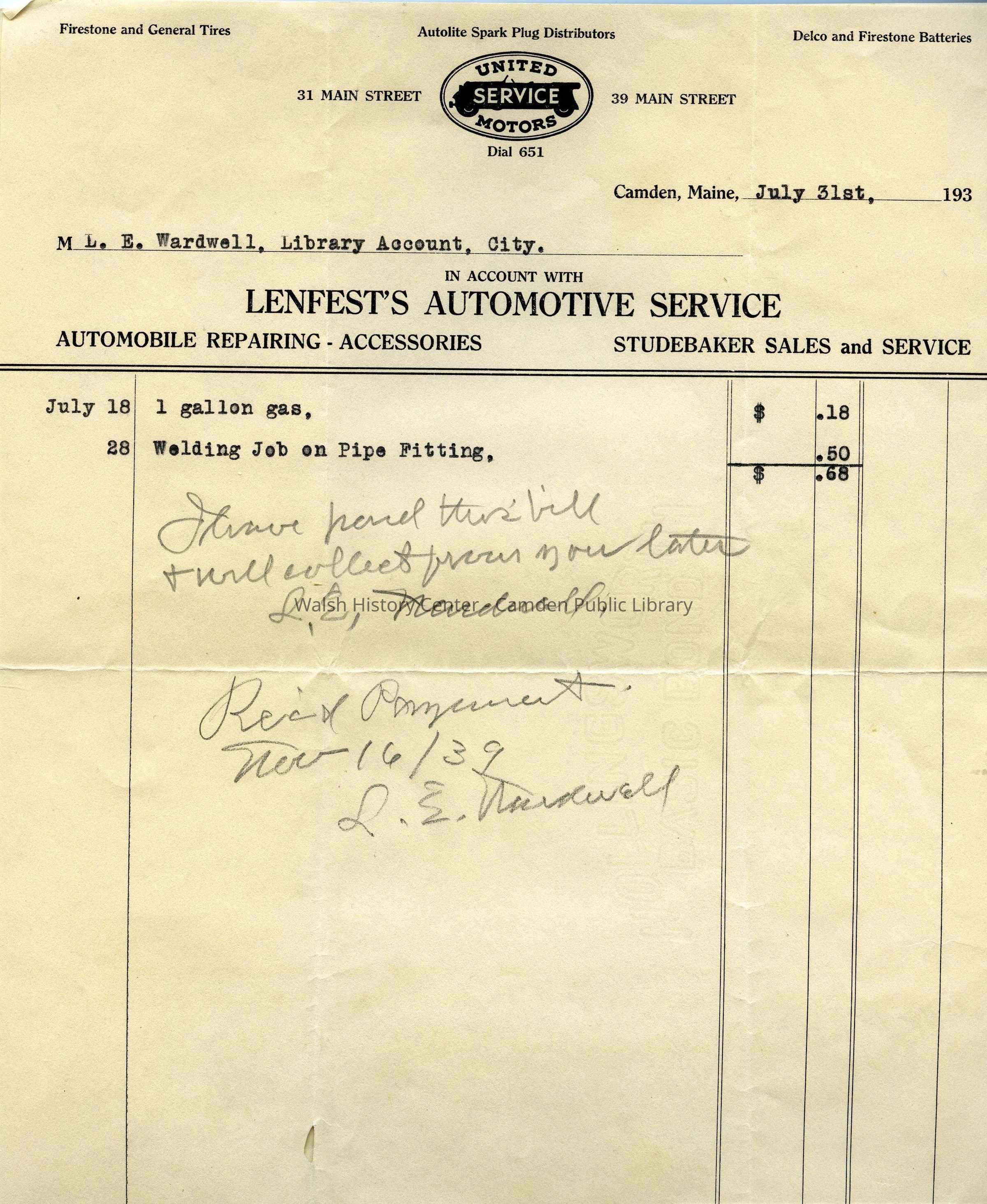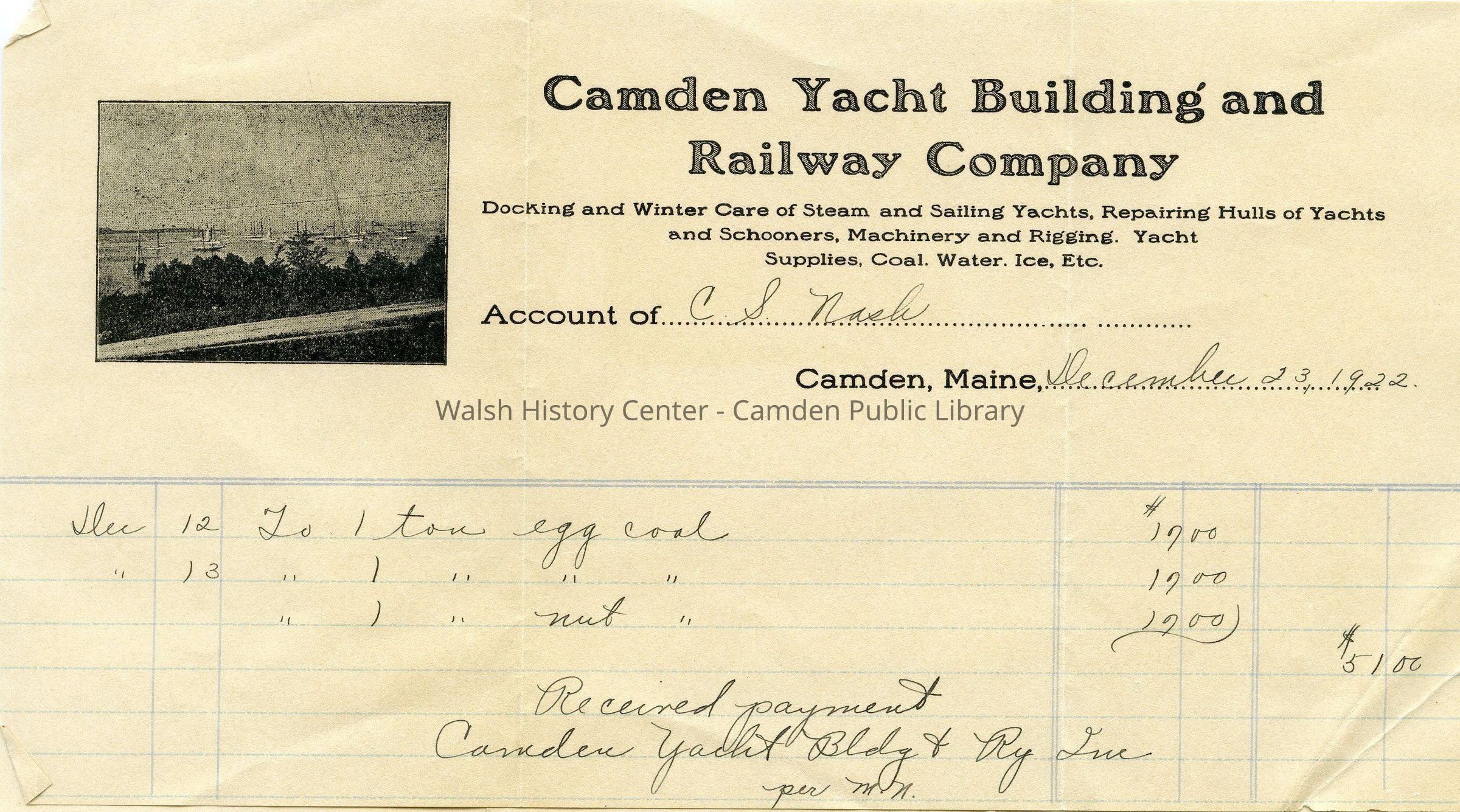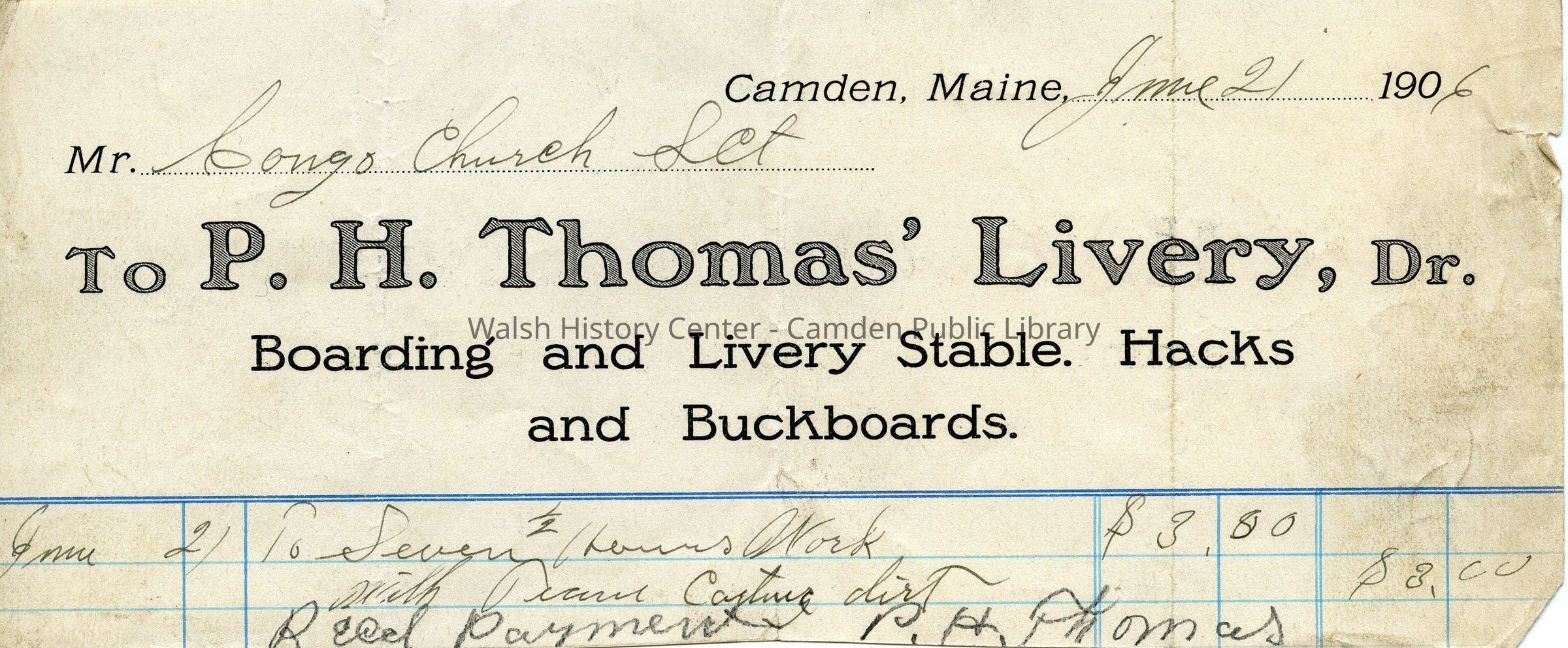 Contains billheads, stationery, bills, letterheads, and receipts from several Camden area businesses. These items date from the 1880's through the 1950's. Partial list of businesses represented: G.W. Achorn; Allen Insurance Agency; Ayers Market; Bay View House; Bay View Street Garage; Boynton's Pharmacy; Brown & Hobbs lumber; Brown's Market; Camden Anchor-Rockland Machine Co.; Camden & Rockland Water Company; Camden Farmer's Union; Camden Lumber Company; Camden Publishing Company; Camden Yacht Building and Railway Company; Carleton, Pascal & Co.; J.C. Curtis Hardware; Follansbee & Wood; Haskell & Corthell; J.H. Hobbs Company; Lenfest's Automotive Service; J.L. Locke; Maiden Cliff Rebekah Lodge; Maine Insane Hospital; The Megunticook Press; A.H. Parsons; Pendleton Dairy; S.G. Ritterbush, contractor; Rockland, Thomaston & Camden Street Railway; S.E. & H.L. Shepherd Company; TalbotArchive Details
