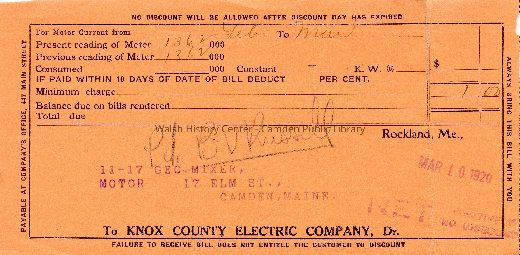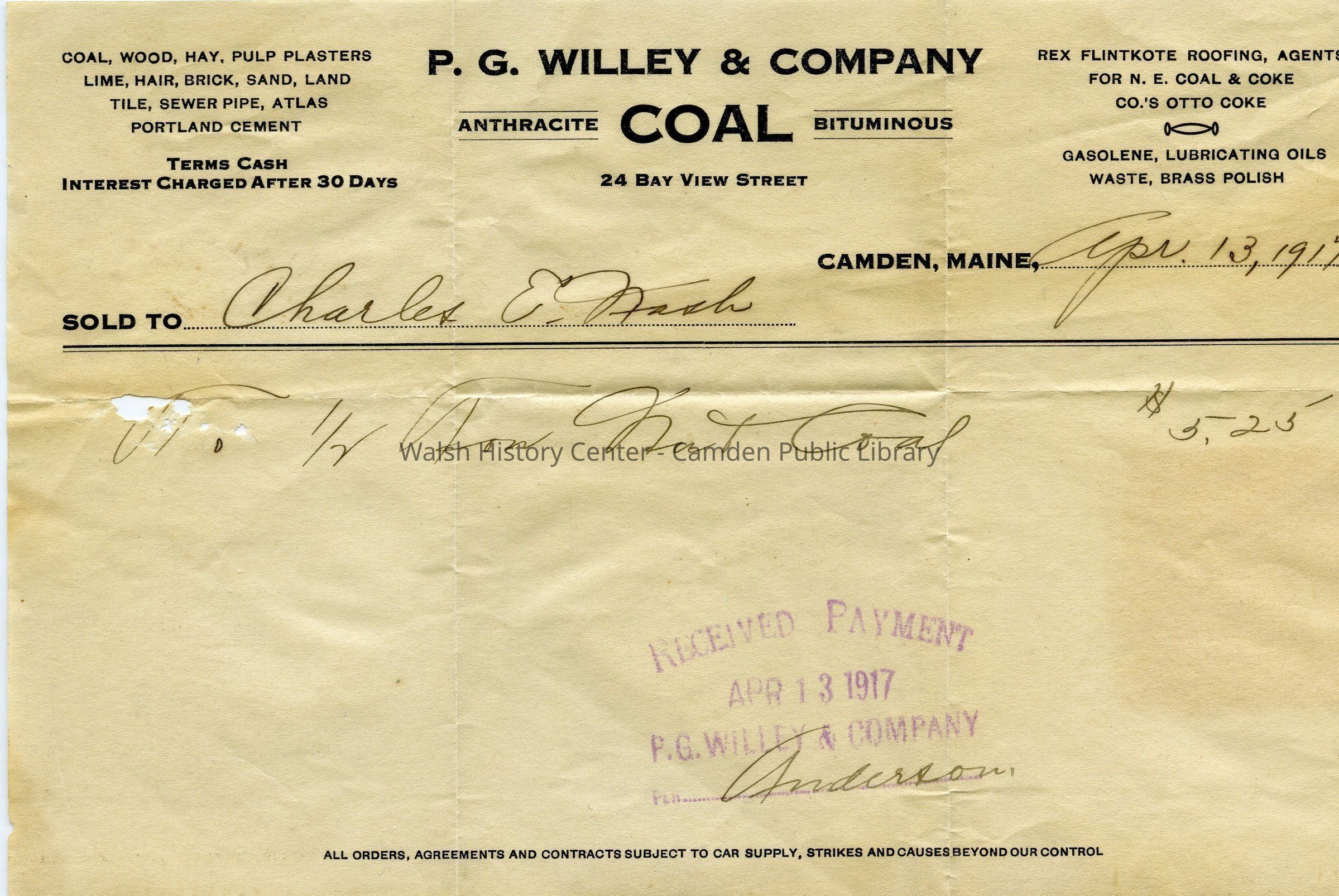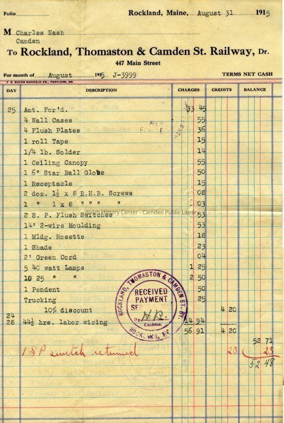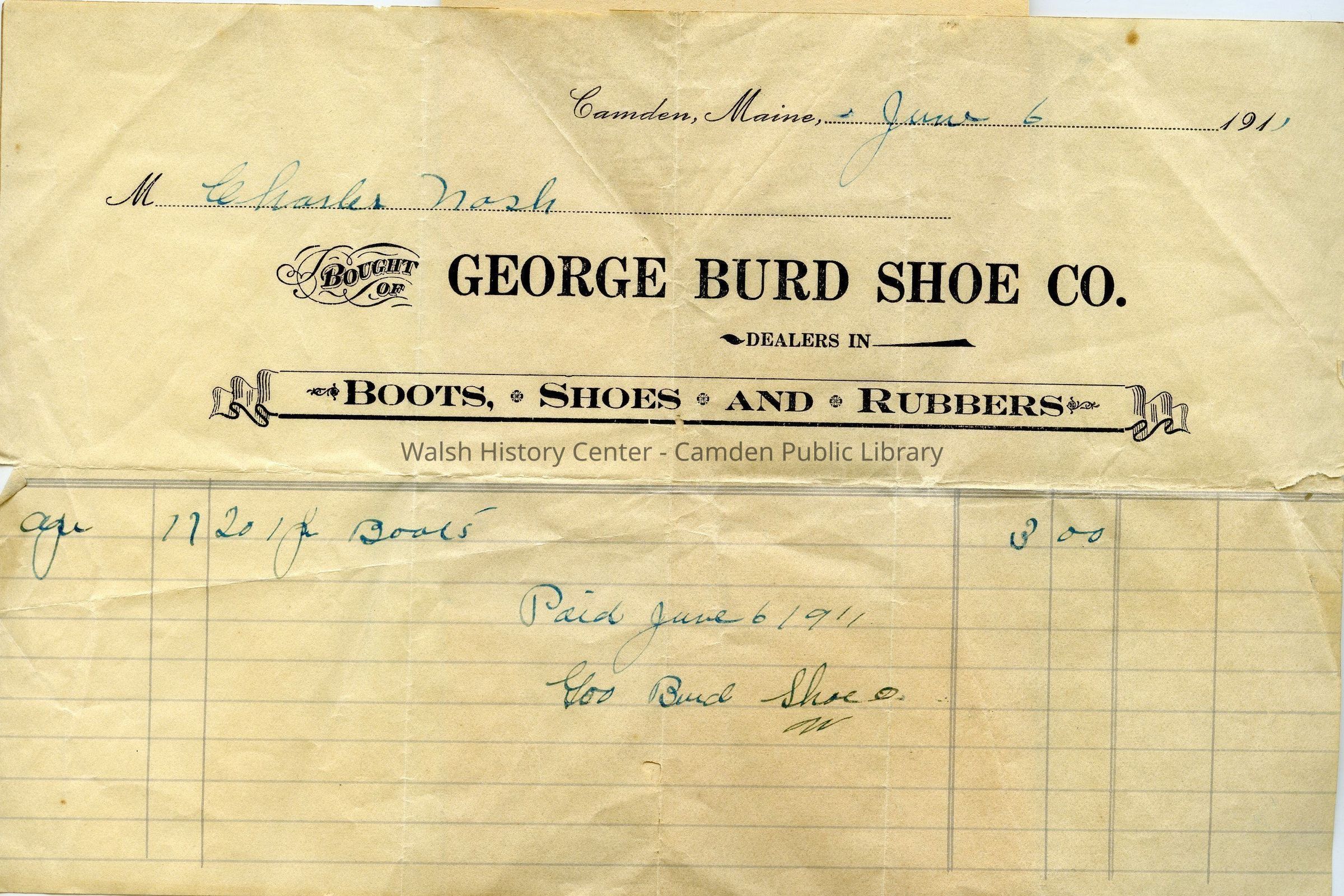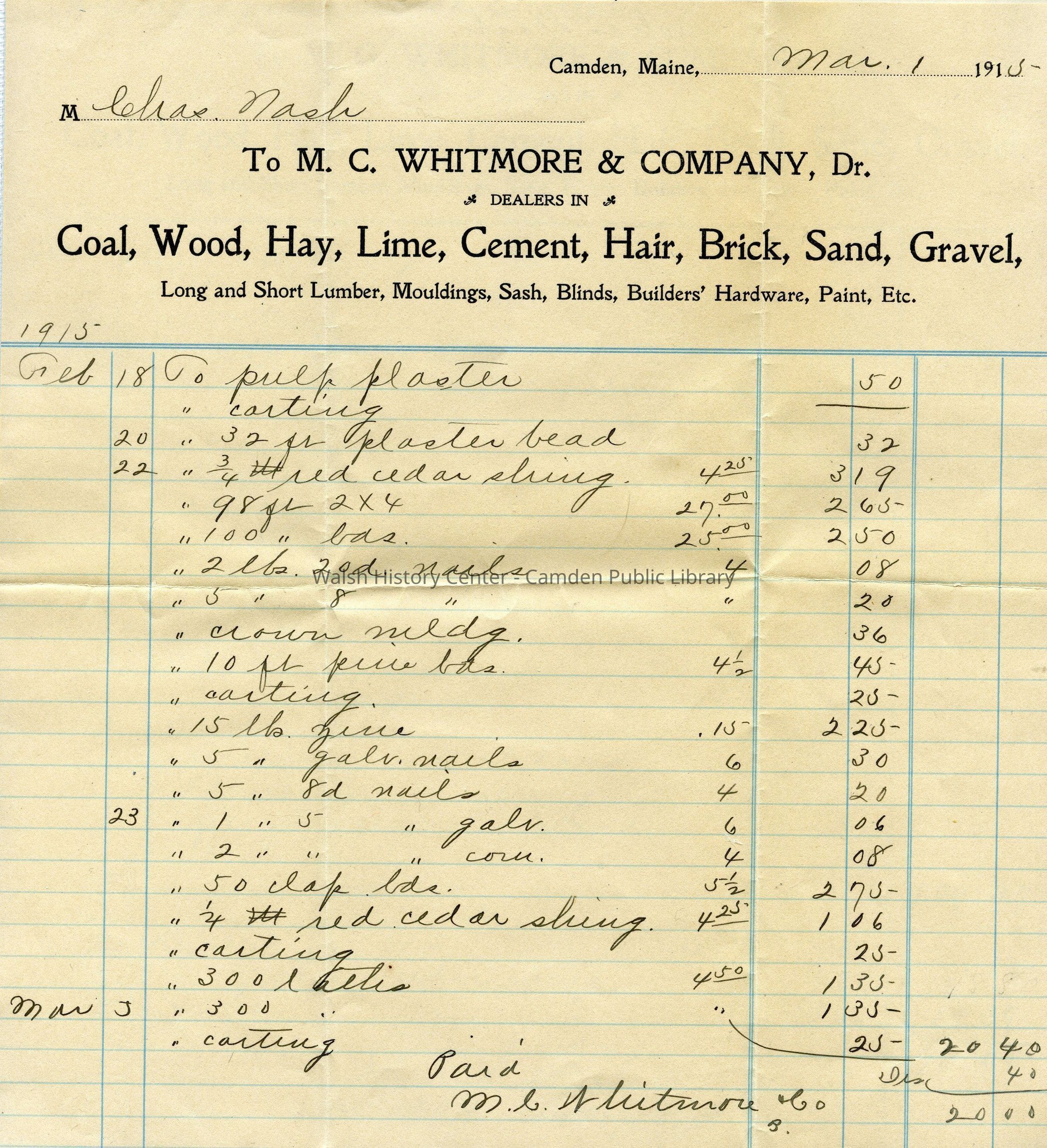 Contains billheads, stationery, bills, letterheads, and receipts from several Camden area businesses. These items date from the 1880's through the 1950's. Partial list of businesses represented: G.W. Achorn; Allen Insurance Agency; Ayers Market; Bay View House; Bay View Street Garage; Boynton's Pharmacy; Brown & Hobbs lumber; Brown's Market; Camden Anchor-Rockland Machine Co.; Camden & Rockland Water Company; Camden Farmer's Union; Camden Lumber Company; Camden Publishing Company; Camden Yacht Building and Railway Company; Carleton, Pascal & Co.; J.C. Curtis Hardware; Follansbee & Wood; Haskell & Corthell; J.H. Hobbs Company; Lenfest's Automotive Service; J.L. Locke; Maiden Cliff Rebekah Lodge; Maine Insane Hospital; The Megunticook Press; A.H. Parsons; Pendleton Dairy; S.G. Ritterbush, contractor; Rockland, Thomaston & Camden Street Railway; S.E. & H.L. Shepherd Company; TalbotArchive Details