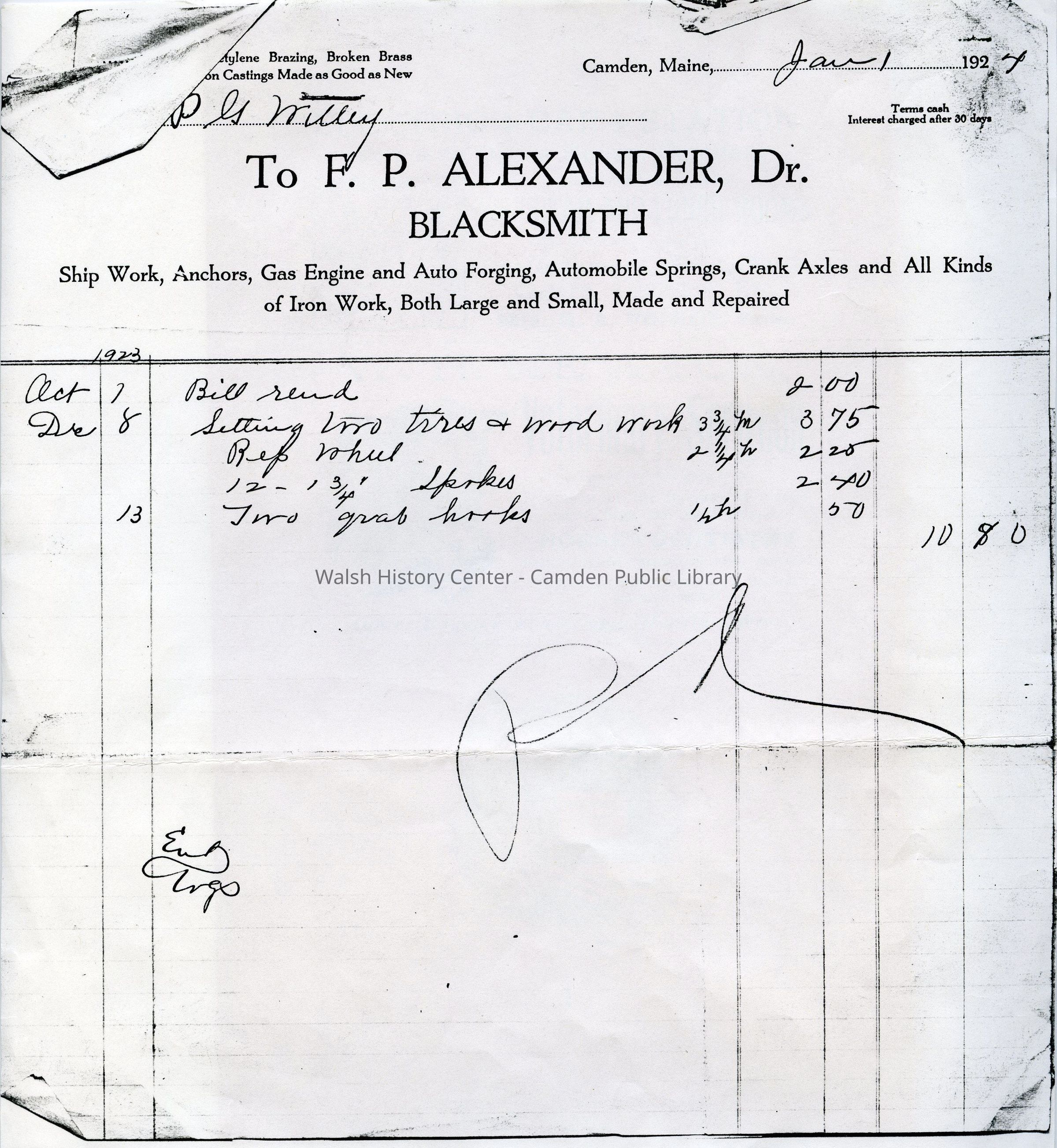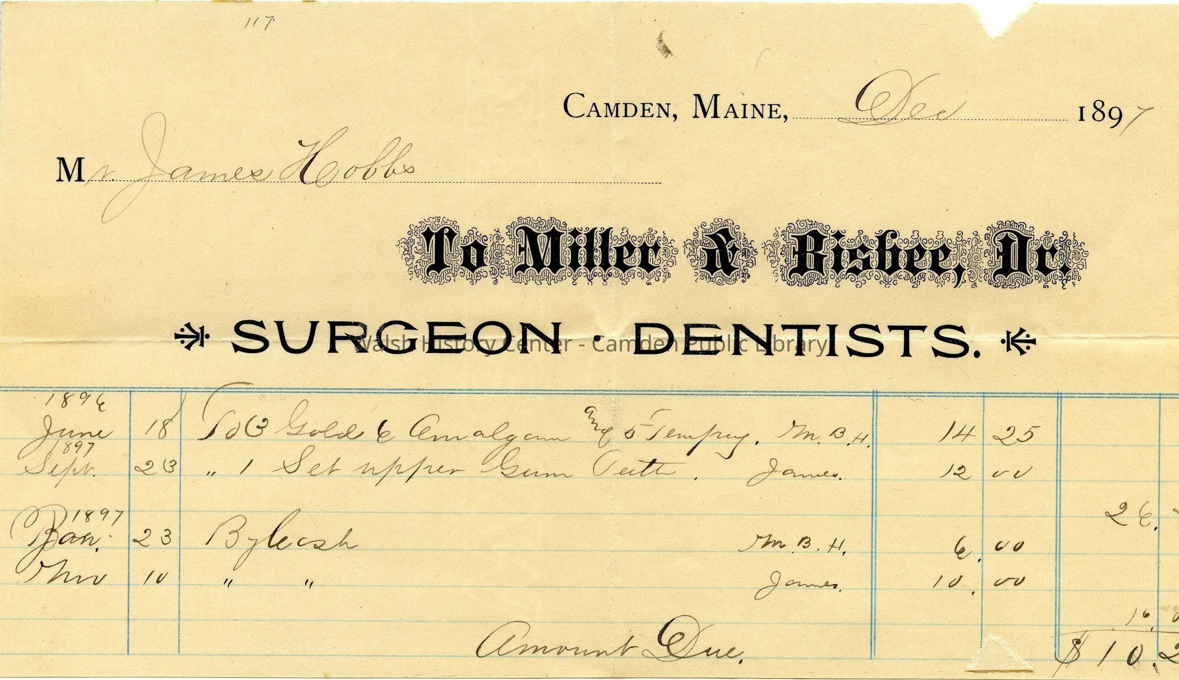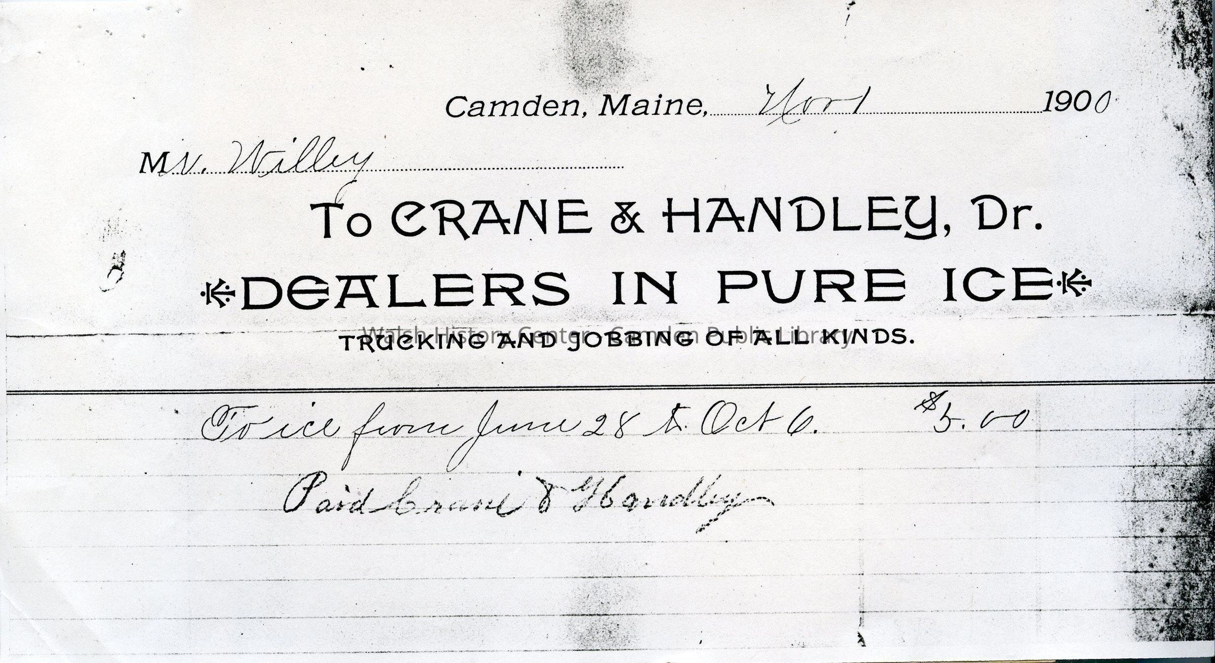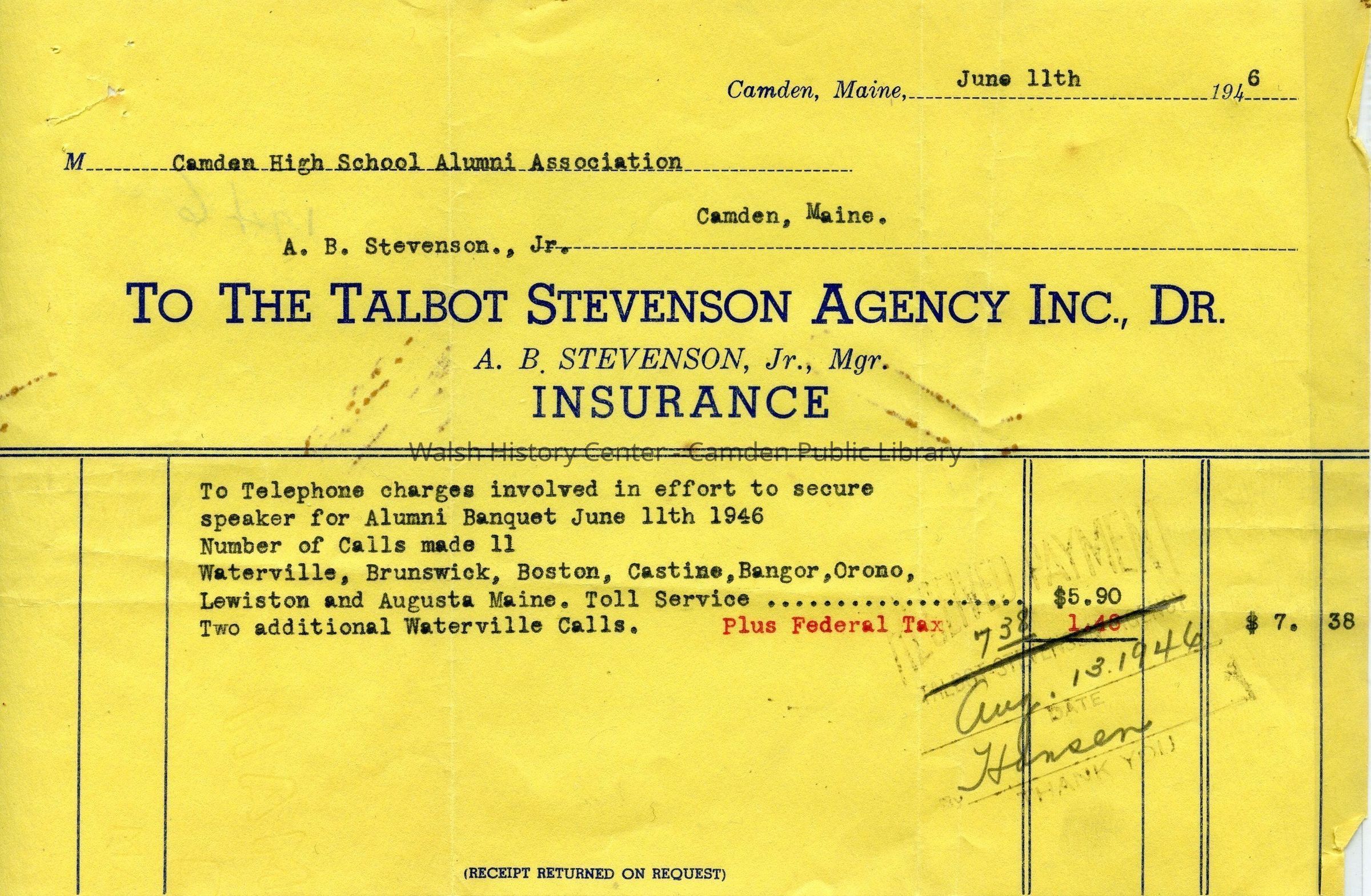 Contains billheads, stationery, bills, letterheads, and receipts from several Camden area businesses. These items date from the 1880's through the 1950's. Partial list of businesses represented: G.W. Achorn; Allen Insurance Agency; Ayers Market; Bay View House; Bay View Street Garage; Boynton's Pharmacy; Brown & Hobbs lumber; Brown's Market; Camden Anchor-Rockland Machine Co.; Camden & Rockland Water Company; Camden Farmer's Union; Camden Lumber Company; Camden Publishing Company; Camden Yacht Building and Railway Company; Carleton, Pascal & Co.; J.C. Curtis Hardware; Follansbee & Wood; Haskell & Corthell; J.H. Hobbs Company; Lenfest's Automotive Service; J.L. Locke; Maiden Cliff Rebekah Lodge; Maine Insane Hospital; The Megunticook Press; A.H. Parsons; Pendleton Dairy; S.G. Ritterbush, contractor; Rockland, Thomaston & Camden Street Railway; S.E. & H.L. Shepherd Company; TalbotArchive Details