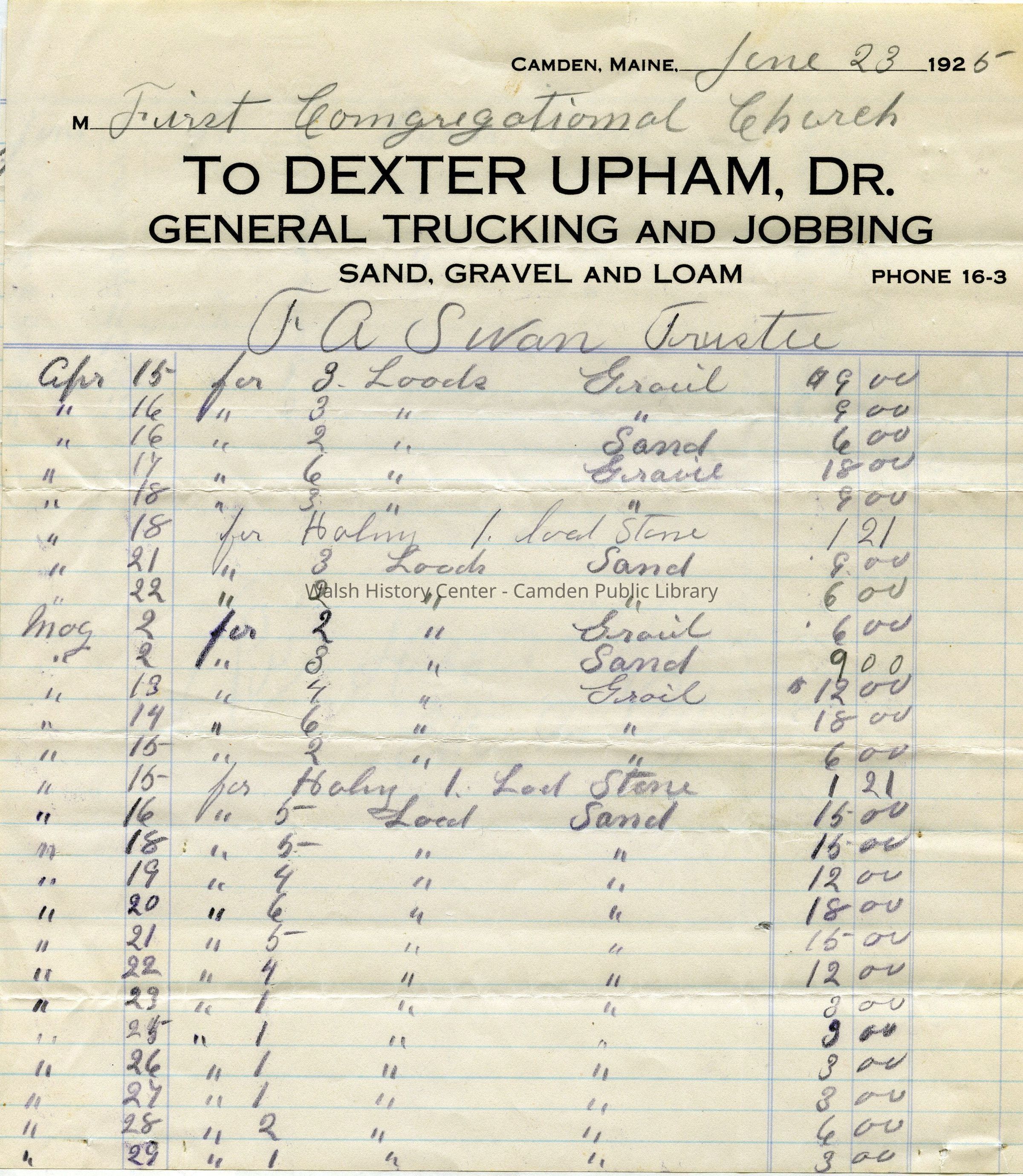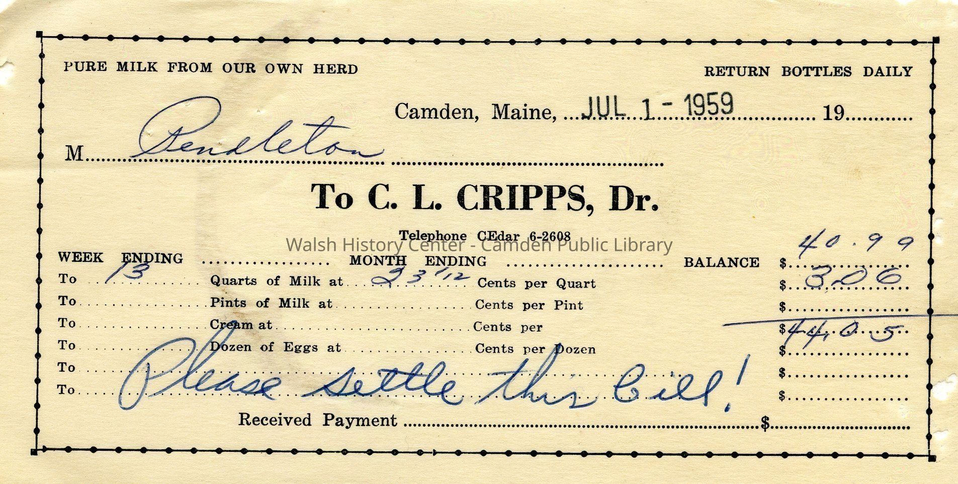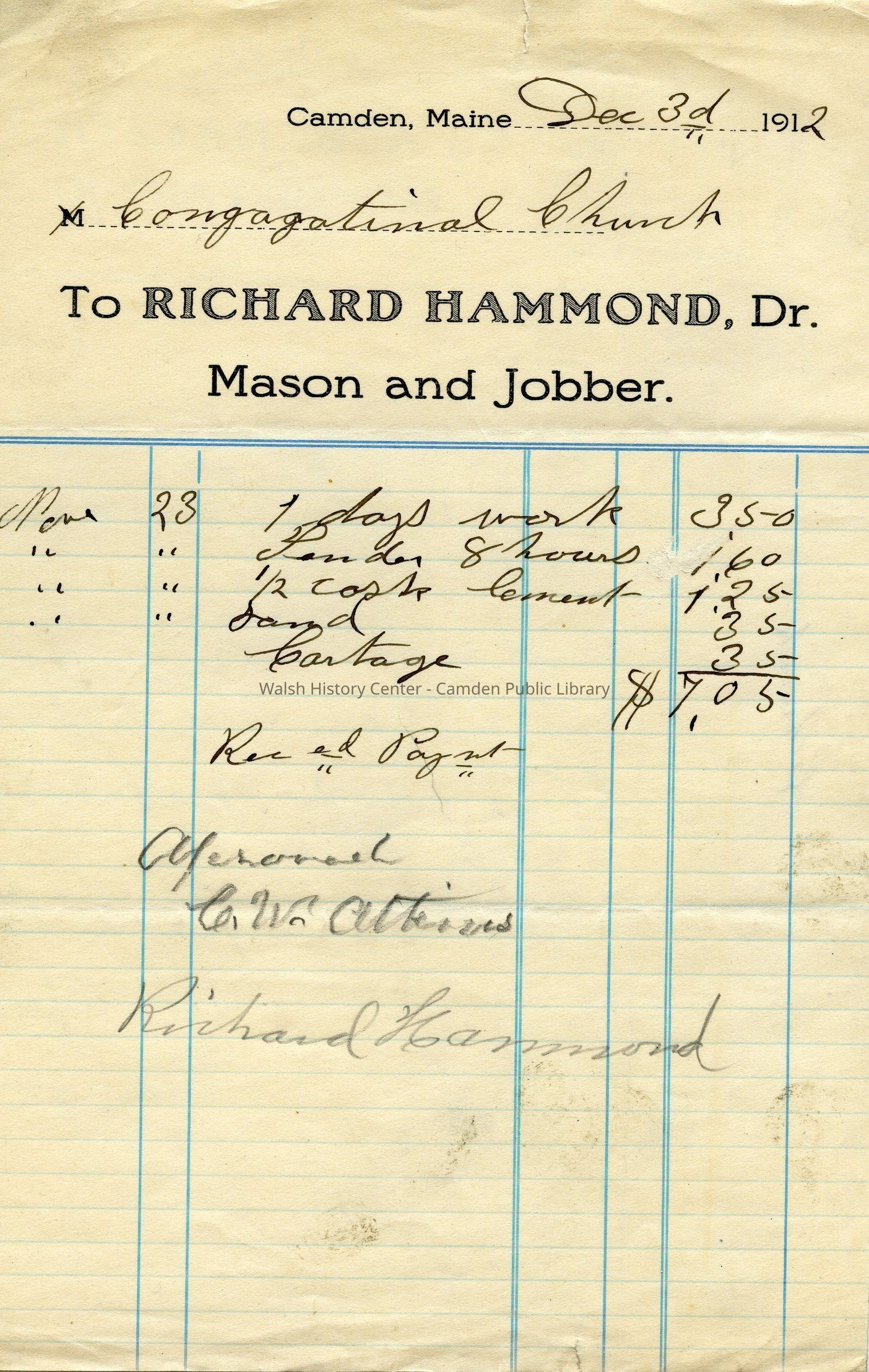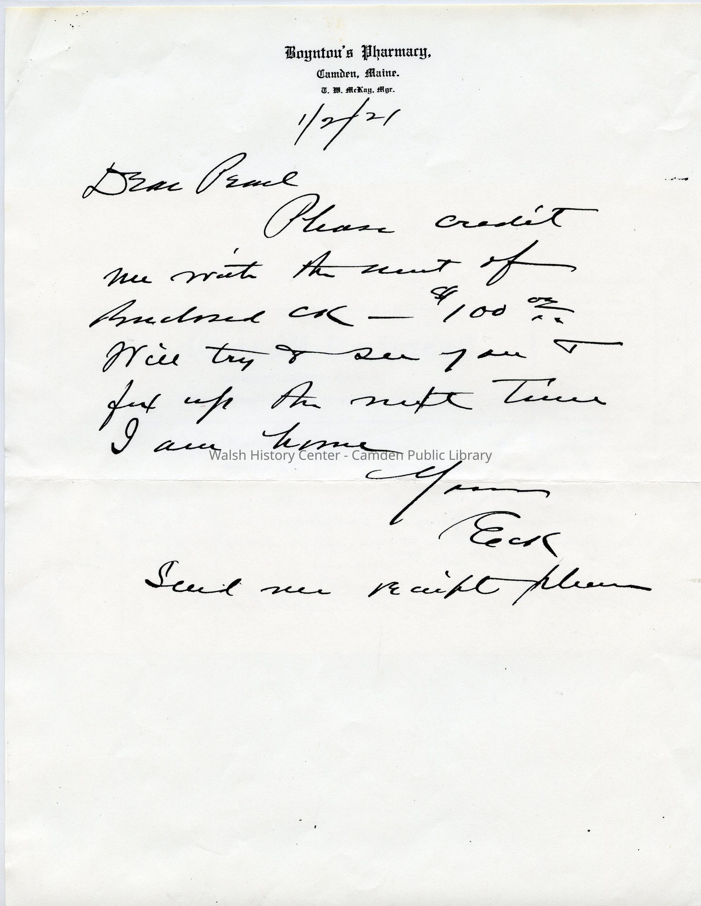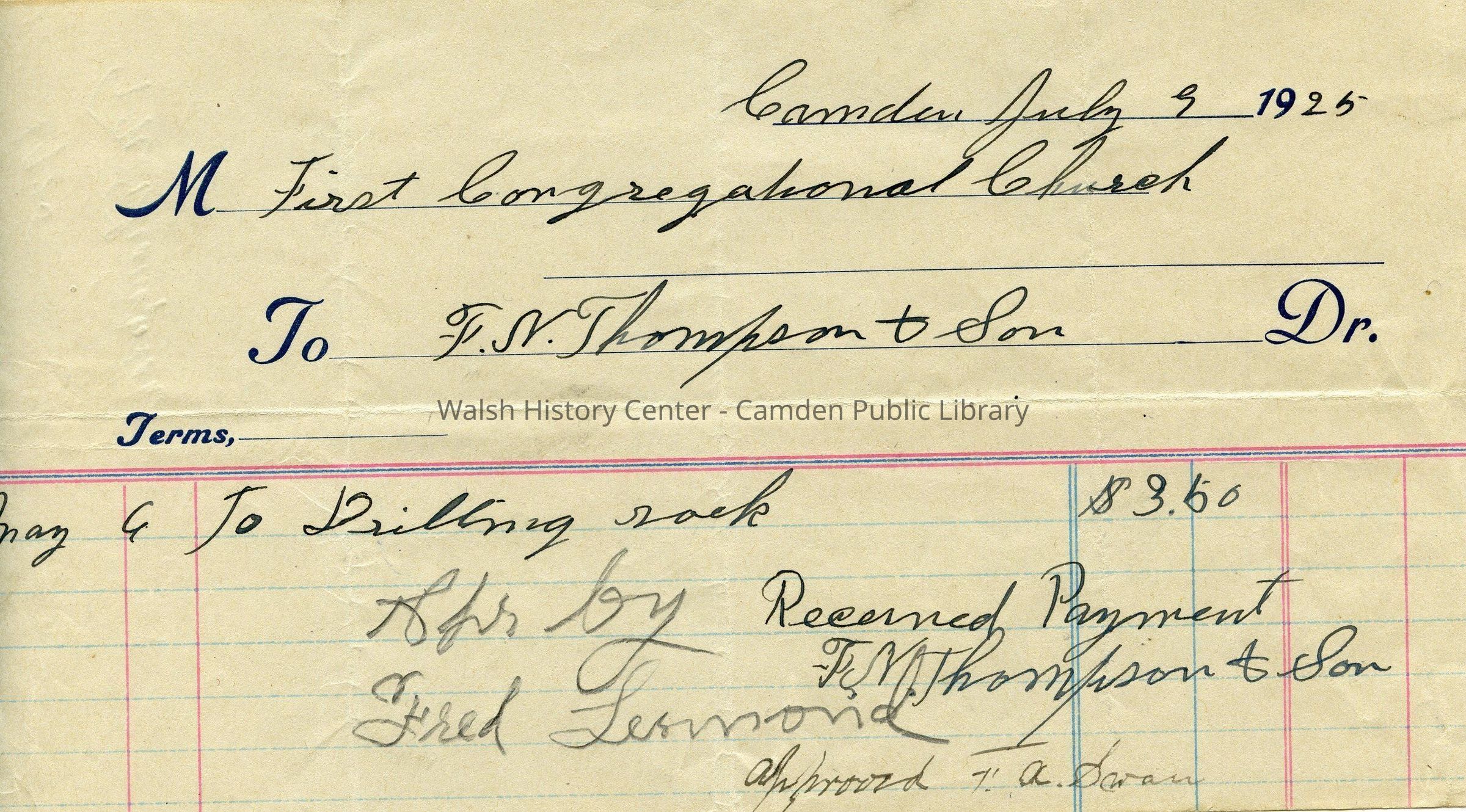 Contains billheads, stationery, bills, letterheads, and receipts from several Camden area businesses. These items date from the 1880's through the 1950's. Partial list of businesses represented: G.W. Achorn; Allen Insurance Agency; Ayers Market; Bay View House; Bay View Street Garage; Boynton's Pharmacy; Brown & Hobbs lumber; Brown's Market; Camden Anchor-Rockland Machine Co.; Camden & Rockland Water Company; Camden Farmer's Union; Camden Lumber Company; Camden Publishing Company; Camden Yacht Building and Railway Company; Carleton, Pascal & Co.; J.C. Curtis Hardware; Follansbee & Wood; Haskell & Corthell; J.H. Hobbs Company; Lenfest's Automotive Service; J.L. Locke; Maiden Cliff Rebekah Lodge; Maine Insane Hospital; The Megunticook Press; A.H. Parsons; Pendleton Dairy; S.G. Ritterbush, contractor; Rockland, Thomaston & Camden Street Railway; S.E. & H.L. Shepherd Company; TalbotArchive Details