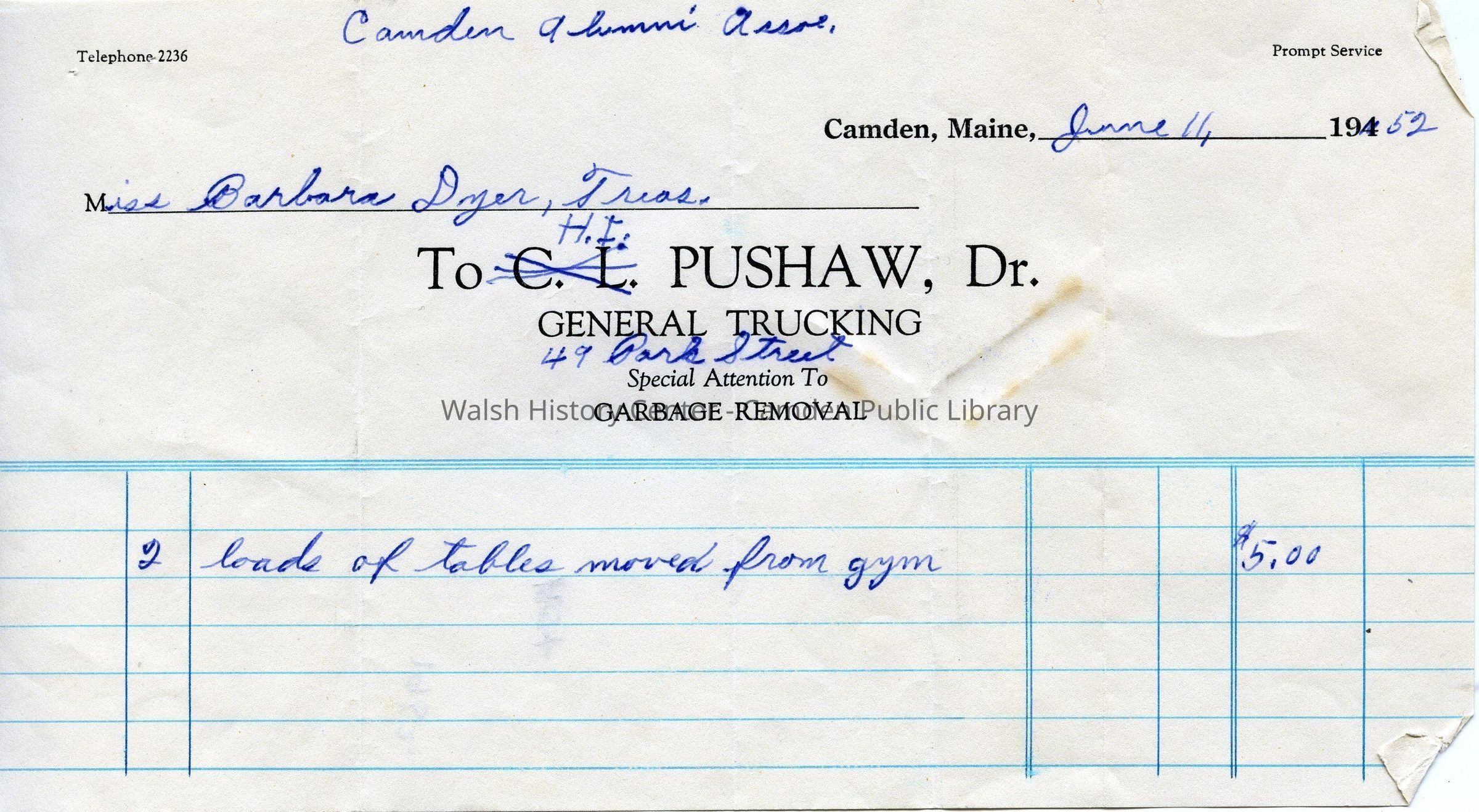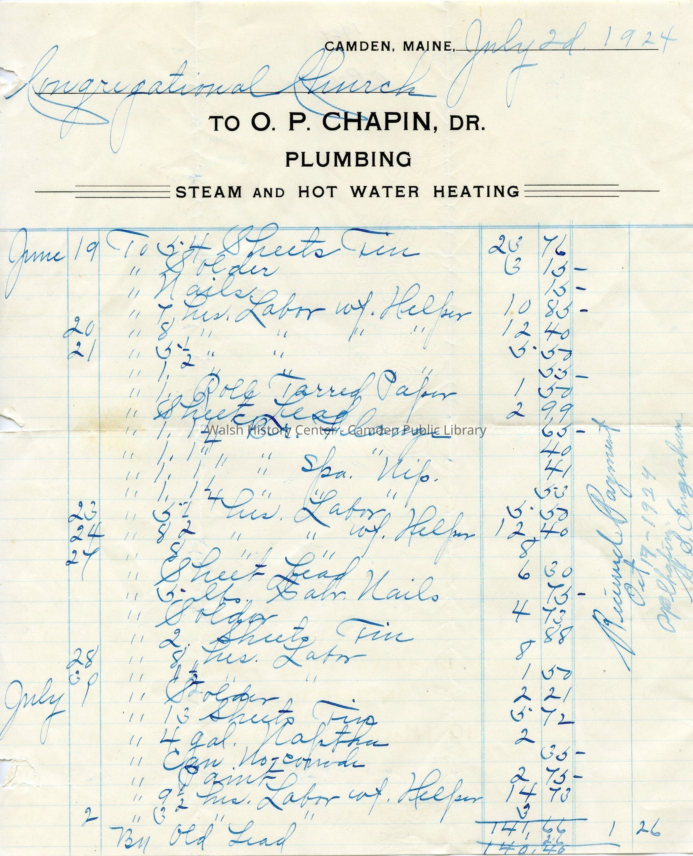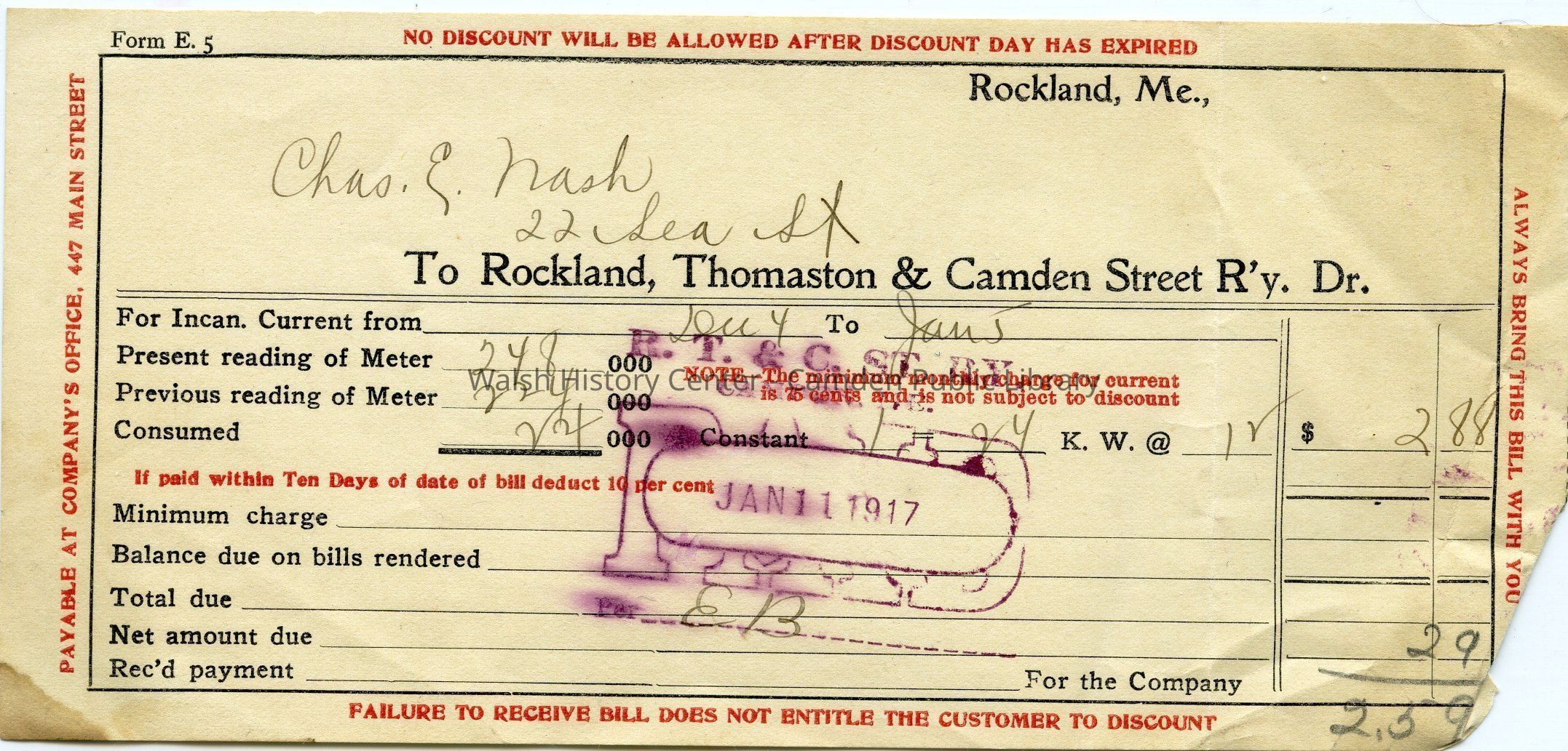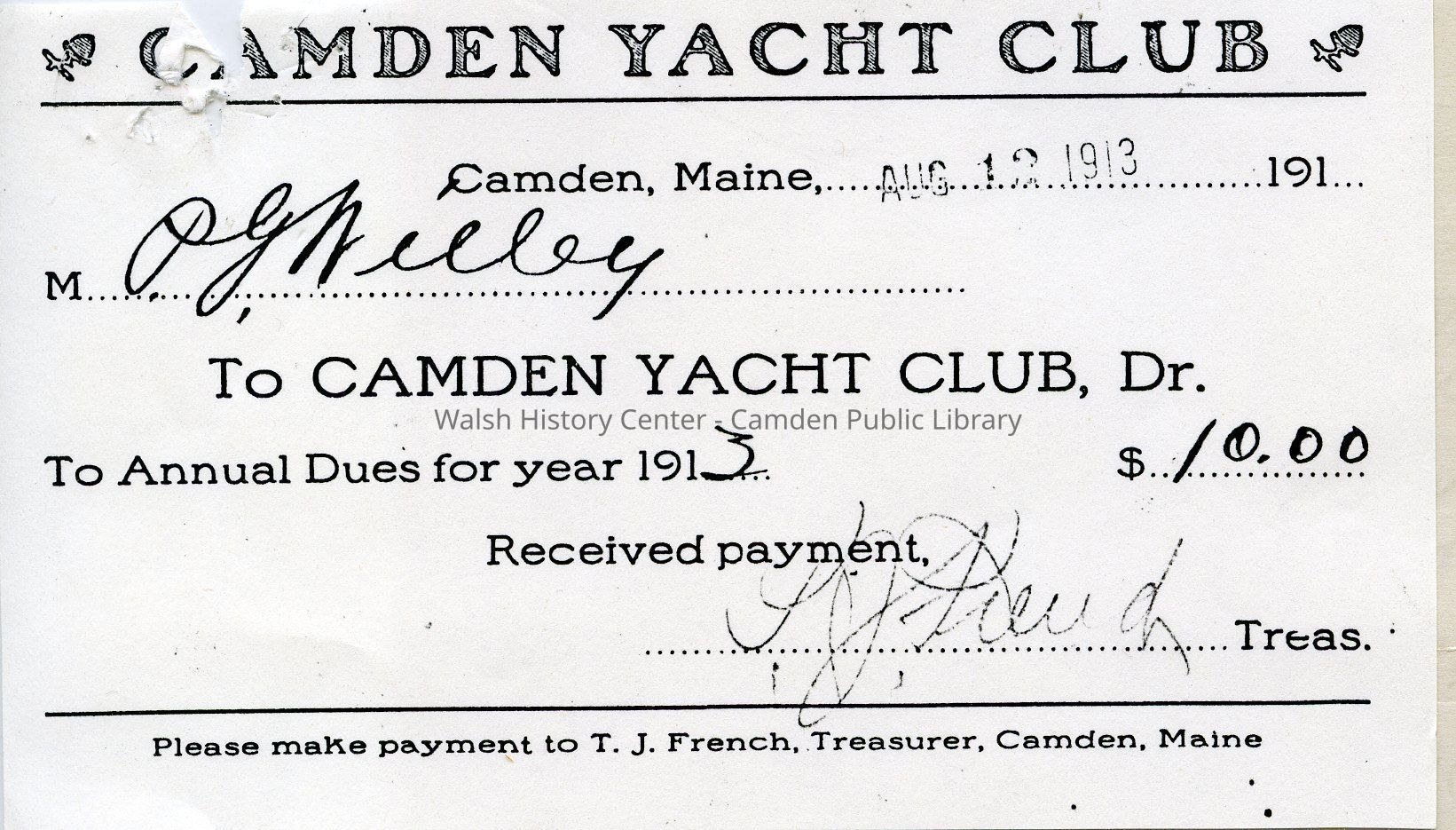 Contains billheads, stationery, bills, letterheads, and receipts from several Camden area businesses. These items date from the 1880's through the 1950's. Partial list of businesses represented: G.W. Achorn; Allen Insurance Agency; Ayers Market; Bay View House; Bay View Street Garage; Boynton's Pharmacy; Brown & Hobbs lumber; Brown's Market; Camden Anchor-Rockland Machine Co.; Camden & Rockland Water Company; Camden Farmer's Union; Camden Lumber Company; Camden Publishing Company; Camden Yacht Building and Railway Company; Carleton, Pascal & Co.; J.C. Curtis Hardware; Follansbee & Wood; Haskell & Corthell; J.H. Hobbs Company; Lenfest's Automotive Service; J.L. Locke; Maiden Cliff Rebekah Lodge; Maine Insane Hospital; The Megunticook Press; A.H. Parsons; Pendleton Dairy; S.G. Ritterbush, contractor; Rockland, Thomaston & Camden Street Railway; S.E. & H.L. Shepherd Company; TalbotArchive Details