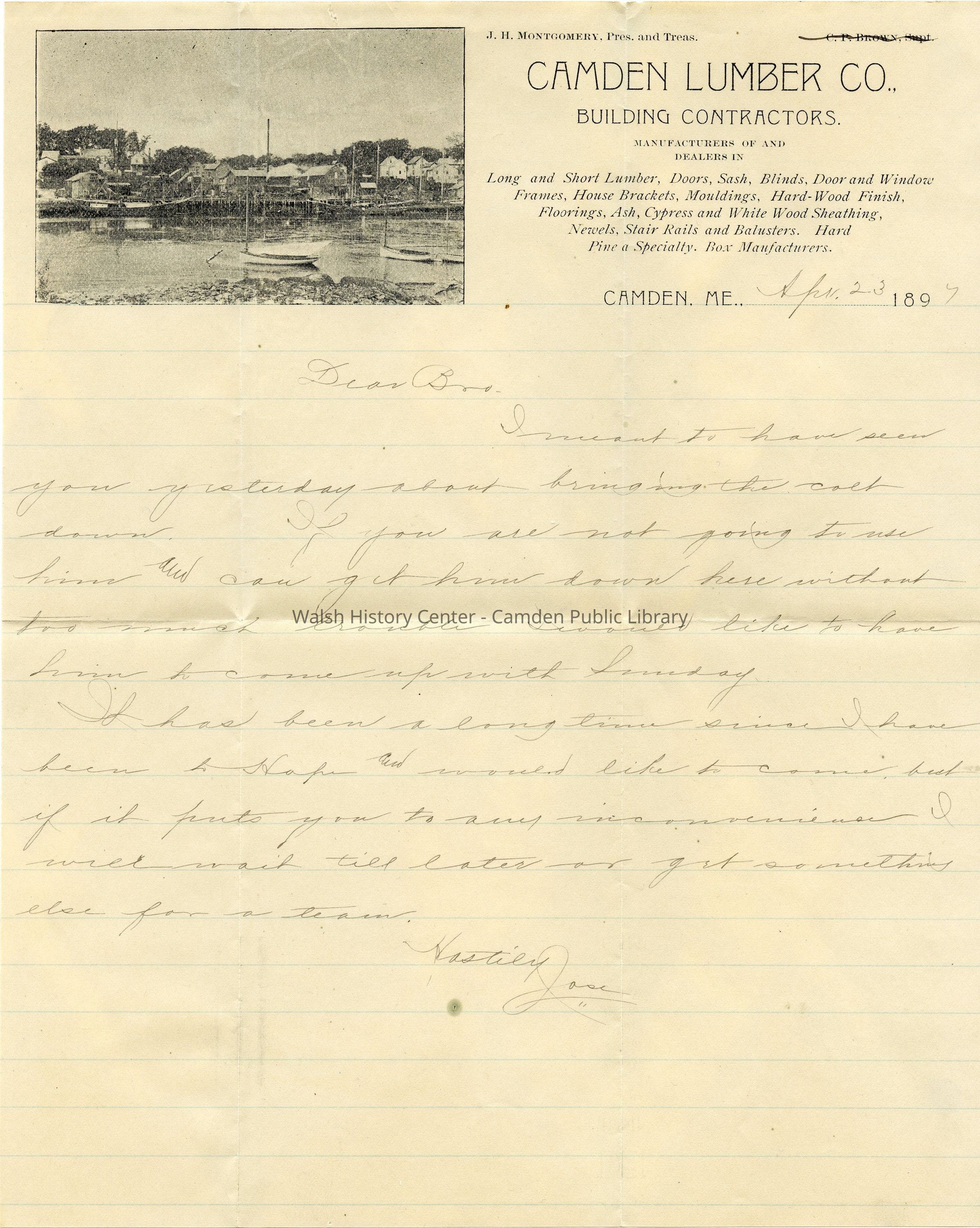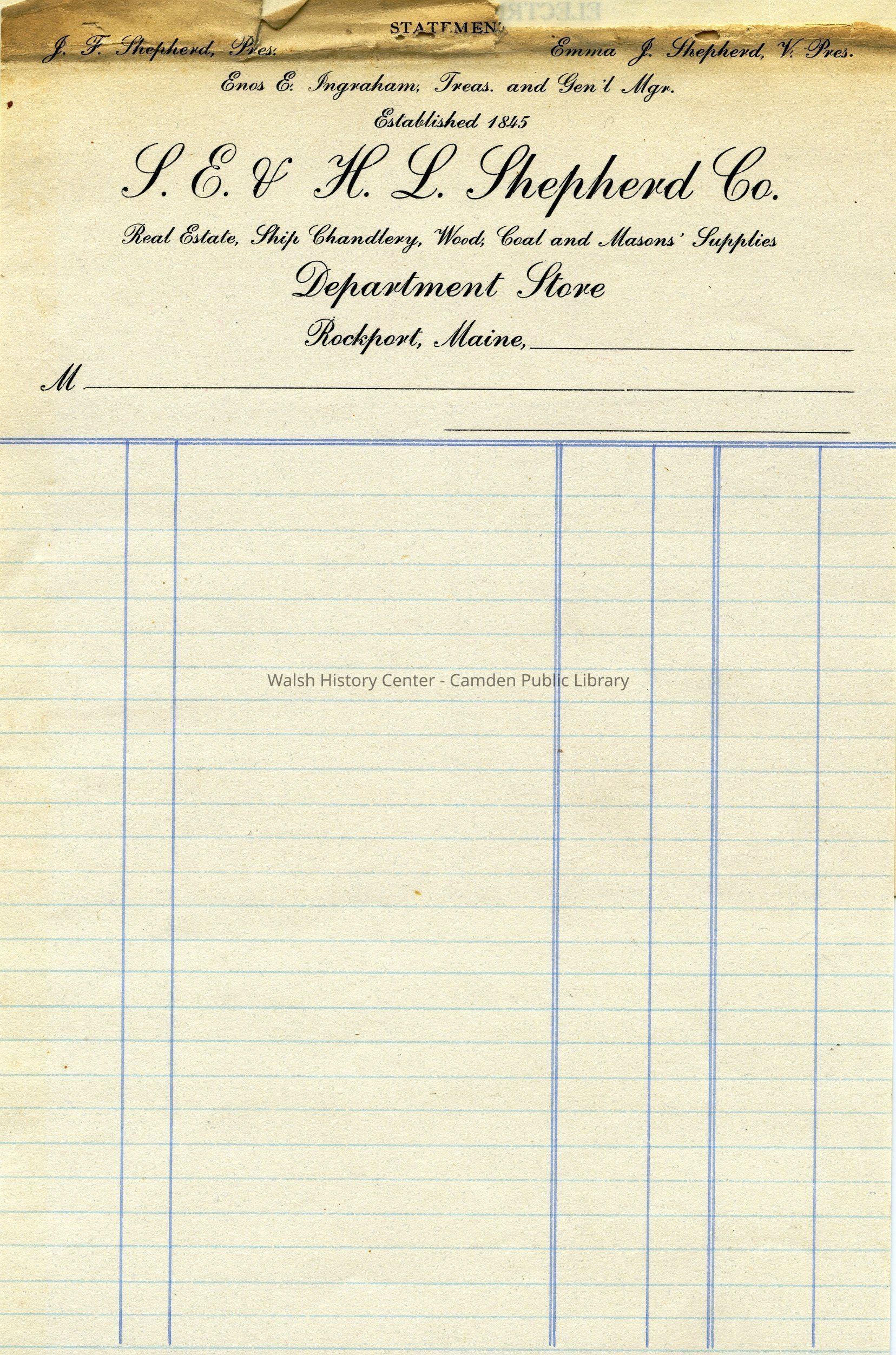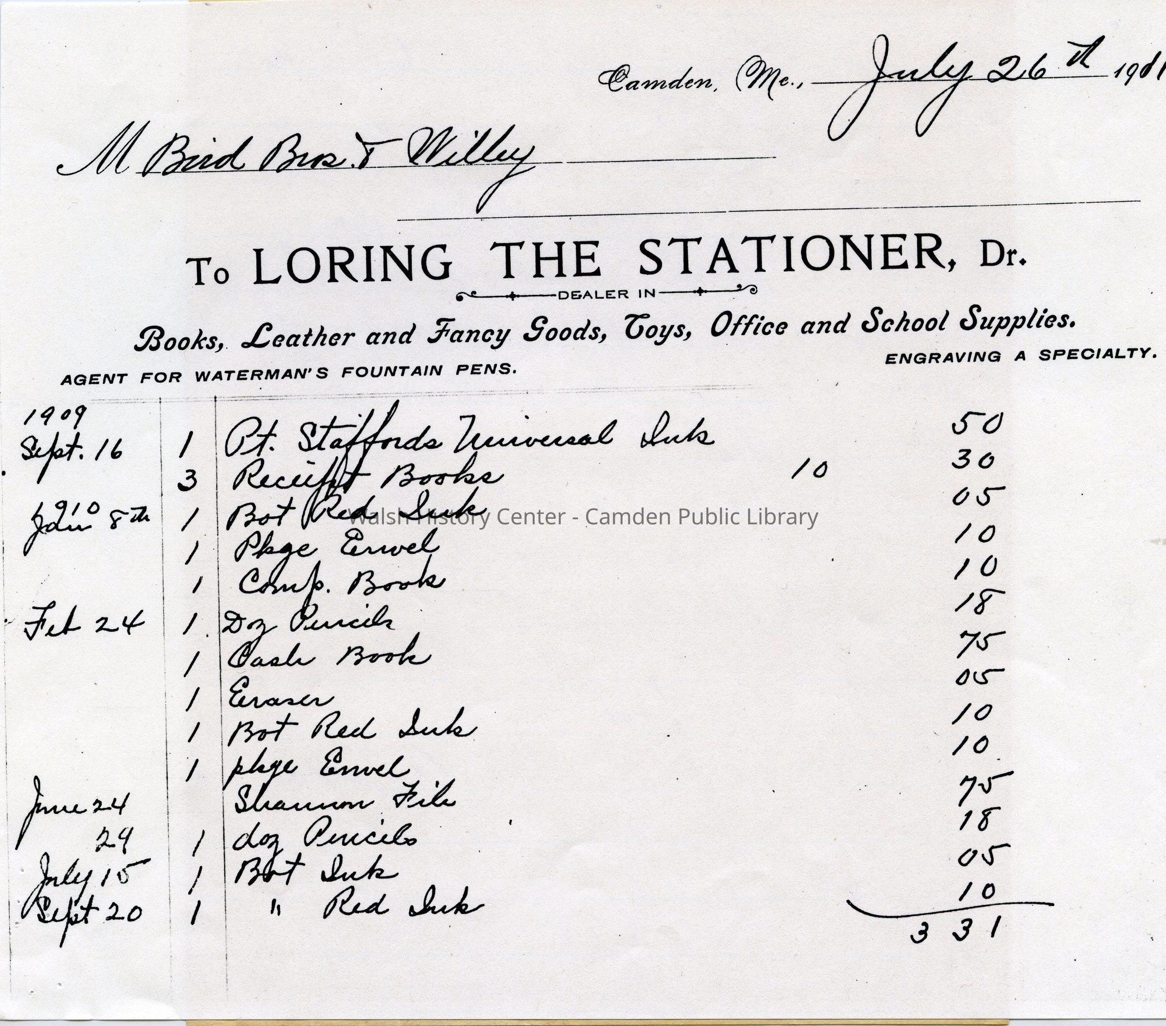 Contains billheads, stationery, bills, letterheads, and receipts from several Camden area businesses. These items date from the 1880's through the 1950's. Partial list of businesses represented: G.W. Achorn; Allen Insurance Agency; Ayers Market; Bay View House; Bay View Street Garage; Boynton's Pharmacy; Brown & Hobbs lumber; Brown's Market; Camden Anchor-Rockland Machine Co.; Camden & Rockland Water Company; Camden Farmer's Union; Camden Lumber Company; Camden Publishing Company; Camden Yacht Building and Railway Company; Carleton, Pascal & Co.; J.C. Curtis Hardware; Follansbee & Wood; Haskell & Corthell; J.H. Hobbs Company; Lenfest's Automotive Service; J.L. Locke; Maiden Cliff Rebekah Lodge; Maine Insane Hospital; The Megunticook Press; A.H. Parsons; Pendleton Dairy; S.G. Ritterbush, contractor; Rockland, Thomaston & Camden Street Railway; S.E. & H.L. Shepherd Company; TalbotCollection