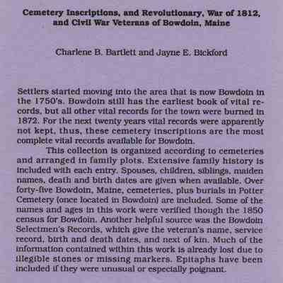 Cemetery inscriptions for Bowdoin, Maine that covers the veterans of the Revolutionary War, War of 1812, and Civil War.