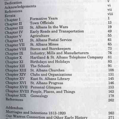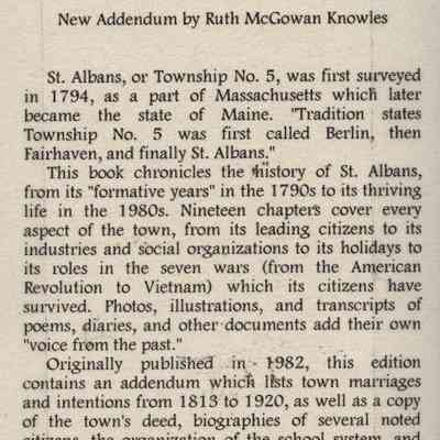 A detailed history of St. Albans from early settlement to the mid-1900's. Included are the deed of the town to Dr. John Warren, genealogical references, activities and highlights of the 175th anniversary celebration, a civil war diary, and an outline of the course of instruction for the schools of 1894.