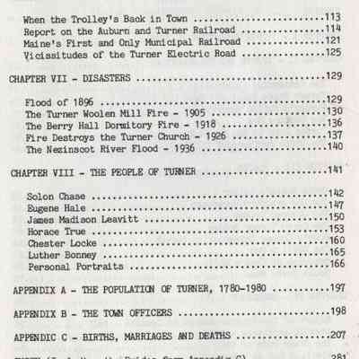 A history of Turner, Maine from 1886 to 1986. Includes an every name index and detailed genealogy as well as centennial and 150 year celebration of town's founding.