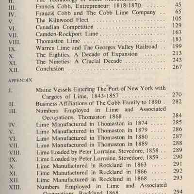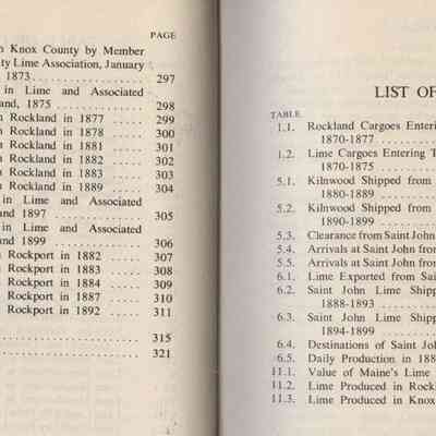 A thorough study of the history of one of Maine's larger industries of the 19th century. Includes chapters on the lime companies, competition with Canada, expansion during the 1880's, vessels carrying lime cargo, businesses affiliated with lime owners, tables depicting the number of casks manufactured and shipped as well as number of thsoe employed.
