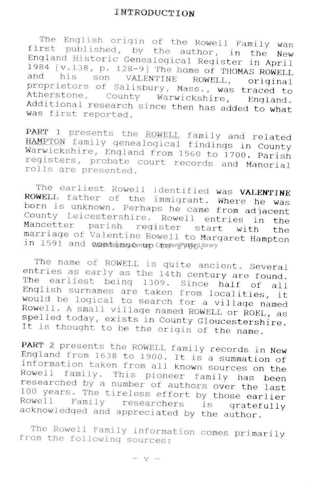 Thomas Rowell and his son Valentine Rowell of Salisbury, Massachusetts were among the orignal proprieters. Their English home was Atherstone, County Warwickshire. Includes English origins as well as New England generations with appendices including Rowell Family members who served in the Revolutionary War, War of 1812, families in Connecticut, New Hampshire, and South Carolina. An everyname index is available.