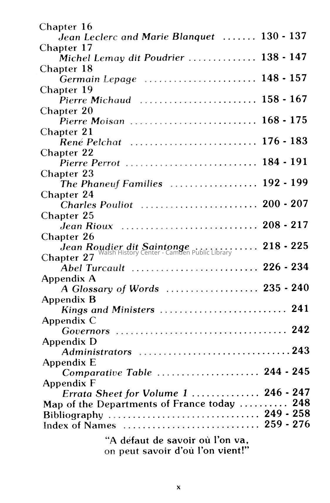 Documentation of life in newly found French Canada 1663 - 1760. List of bibliographic materials, glossary of words found in French-Canadian genealogy, kings and ministers, and index of names are included.