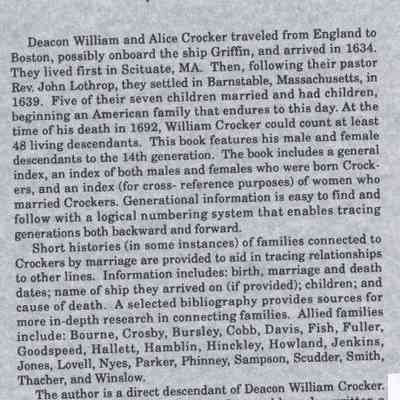 Short histories and genealogy including vital statistics of the Crocker family of Scituate and then Barnstable, Massachusetts. Direct descendants of Deacon William and Alice Crocker arriving Boston 1634.