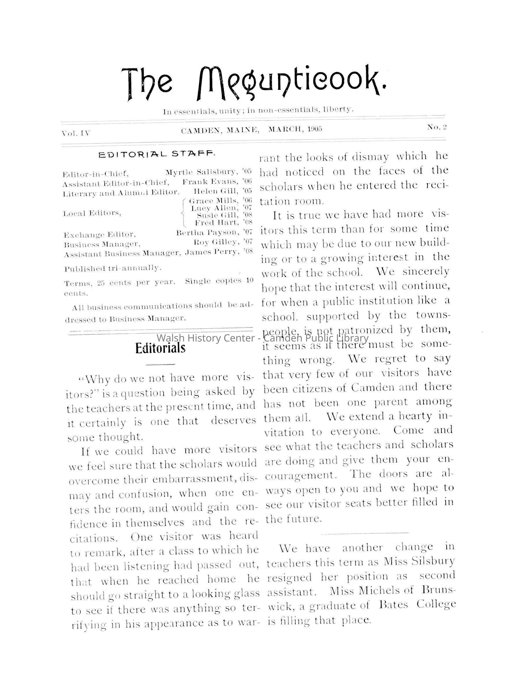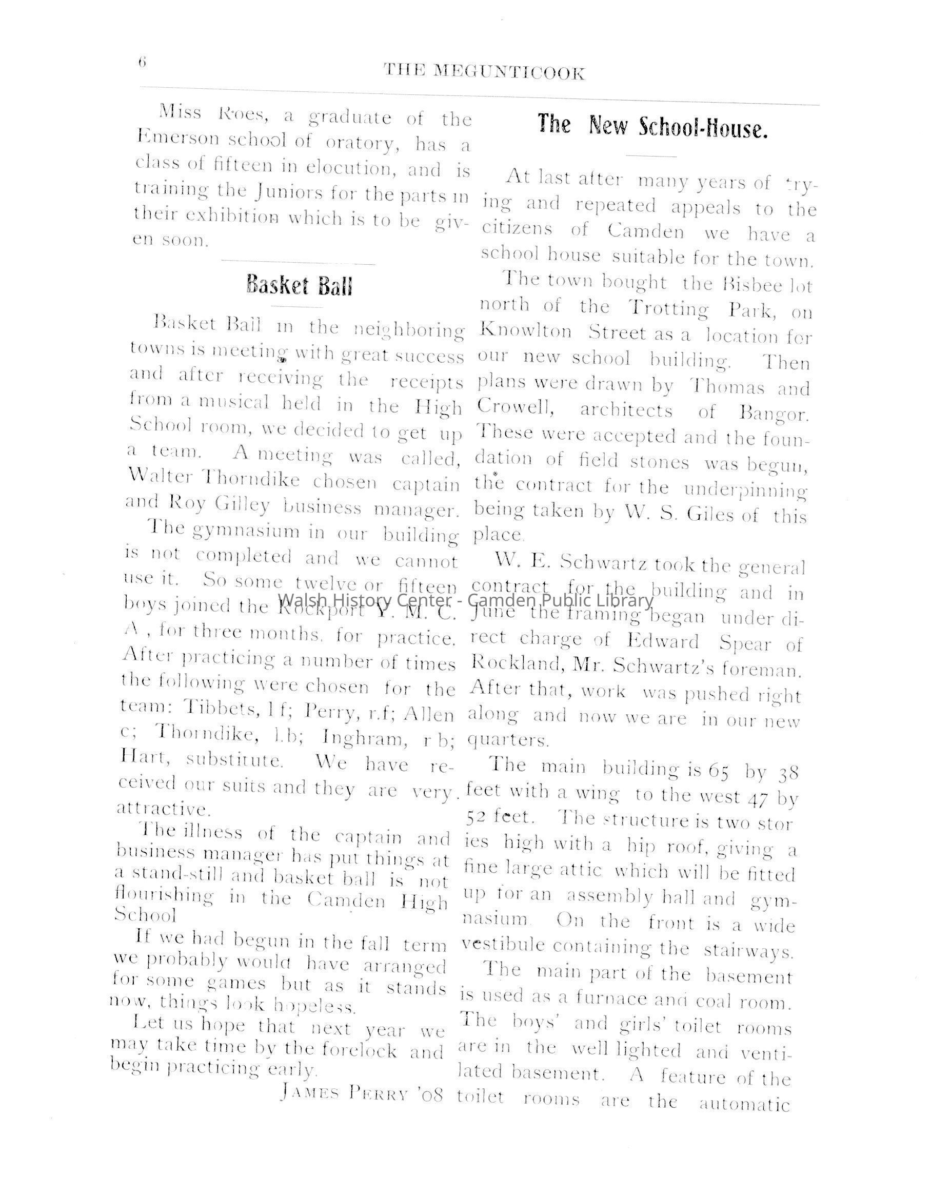 Camden High School publication. March 1905. Vol. 4, No. 2. Includes advertisers, alumni notes from Class of 1902 and 1903, school news, and student writings. Includes a student essay on the new school house on Knowlton Street and the formation of a basketball team.