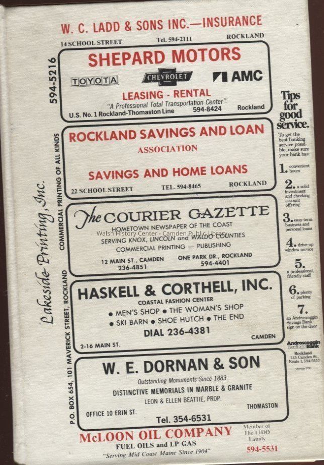 Rockland, Camden, Rockport and Thomaston directory. Alphabetical listing of individuals, businesses, and streets. Classified business directory. Includes information on city and village governments, societies, churches, and schools. Advertisements. Numerical telephone locater included.