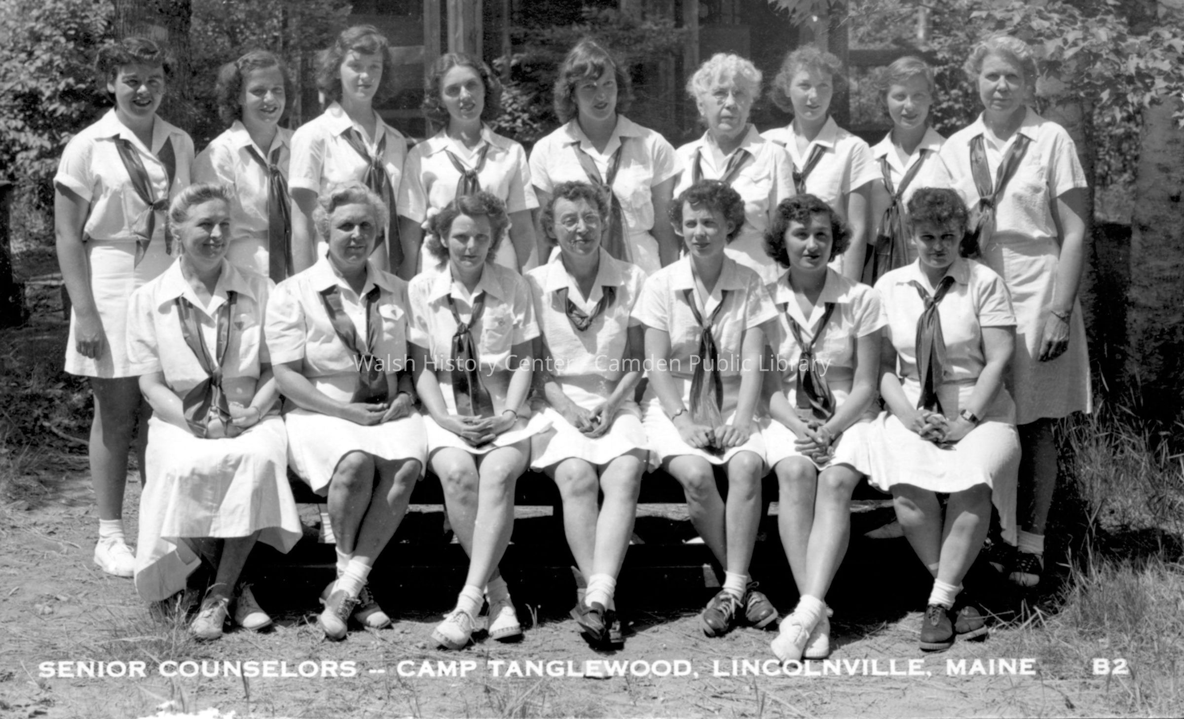 Photo on front of postcard features the senior counselors at Camp Tanglewood, Lincolnville, Maine. Back of postcard is postmarked Lincolnville, Maine July 20, 1950.