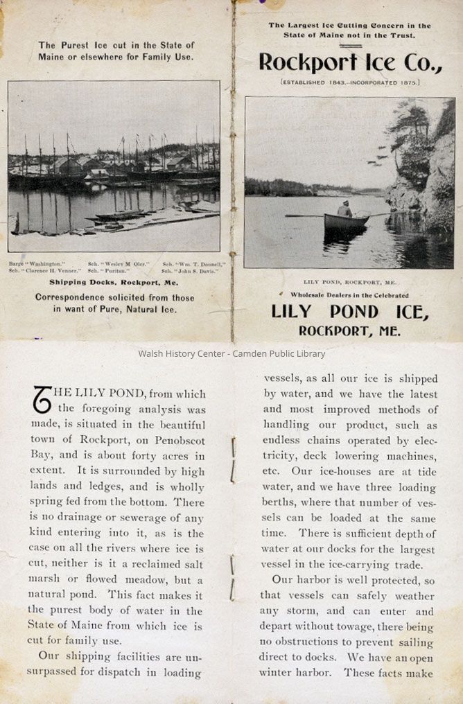 Advertisement and article featuring Rockport Ice Co. on Lily Pond in Rockport, Maine.Collection