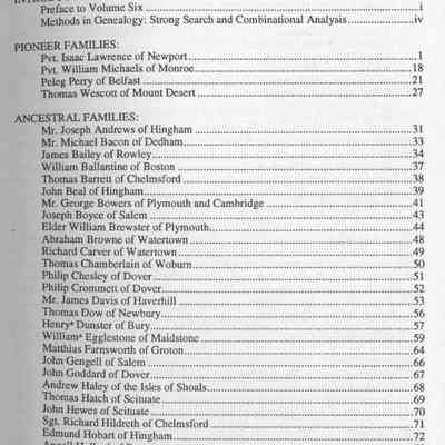 Biographical essays on settlers of Penobscot, Maine focusing on the pioneer families of Pvt. Isaac Lawrence of Newport, Pvt. William Michaels of Monroe, Peleg Perry of Belfast, and Thomas Wescott of Mount Desert.