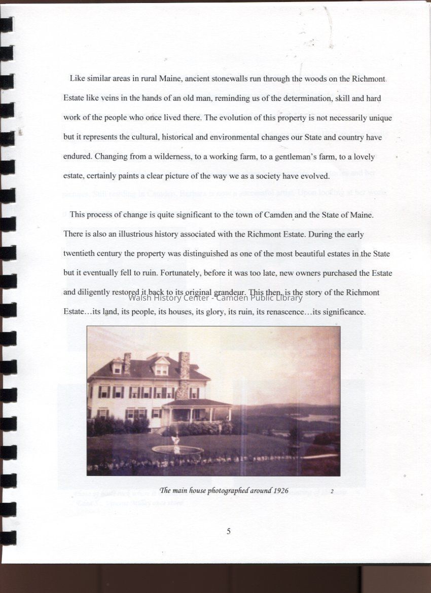 History of "Richmont," the Rich family estate on Rt. 105 in Hope, Maine. Purchased in 1991 by singer Don McLean, it is now called by its former name "Lakeview." Built circa 1907, the property was purchased in 1914 by Henry Haven Windsor, a wealthy businessman from Chicago. Upon Windsor's death from influenza, Walter J. Rich, Sr. of New York City bought the 180-acre property in 1924 as a summer home and renamed it "Richmont," and the property remained in the Rich family until 1966.