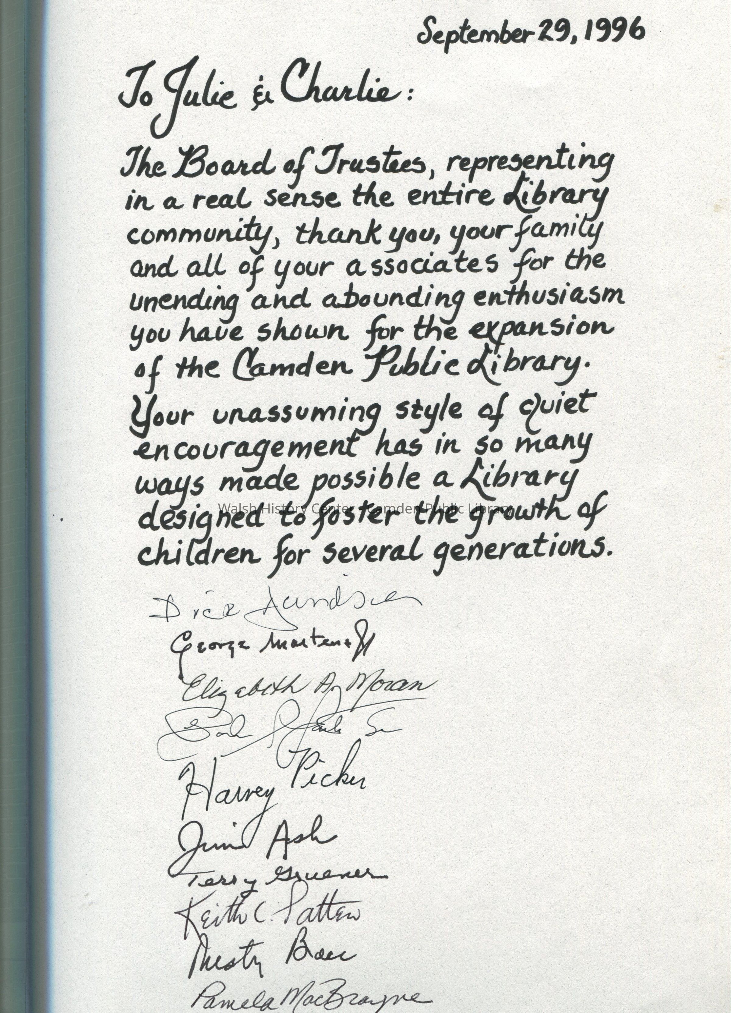 Commemorative copy of "A Century of Service" history of the Camden Public Library. This edition was a gift to Charles and Julie Cawley and was signed September 29, 1996 by the Board of Trustees in recognition of their philanthropy.Collection