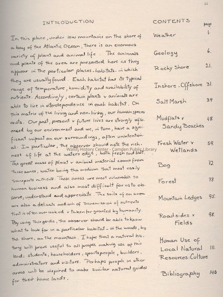 A natural history of the Camden and Rockport area covering weather patterns, geological composition of the land and the varieties of plant and animal life found here.