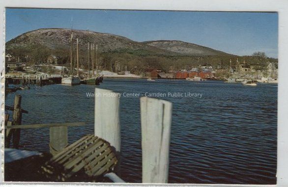 Color postcard of Camden, Maine, showing the harbor and Mt. Battie.Collection