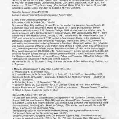 Genealogy research relating to the genealogy of the Benjamin Jones Porter, born 20 September 1763 in Wenham, Massachusetts, died 18 August 1847 in Camden, Maine. Research covers three generations.Collection