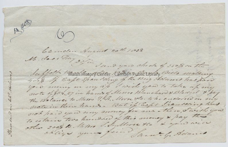 Letter to Joel Fay of Boston, Massachusetts from Samuel G. Adams of Camden, Maine dated 20 August 1838Entry/Object ID