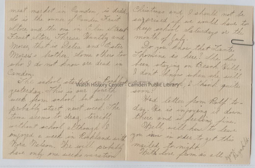 Have just had my supper and thought I would write you a few lines. How are you and your friends getting along? Are you still a nurse? It is getting better around here, in Rockland anyway. They have been using a hotel there as hospital there and in Camden the Congregational Chapel is being used. I suppose you know that Mrs. Smally is dead. It was a private funeral, no flowers. Mr. Jones, who had the meat market in Camden, is dead. So is the owner of Camden Fruit Store and the one in Elm Street Fruit Store, Thresa Huntly and Morse, that is delia and Ester Morse's brother. Some others too who I do not know are dead in Camden."Collection
