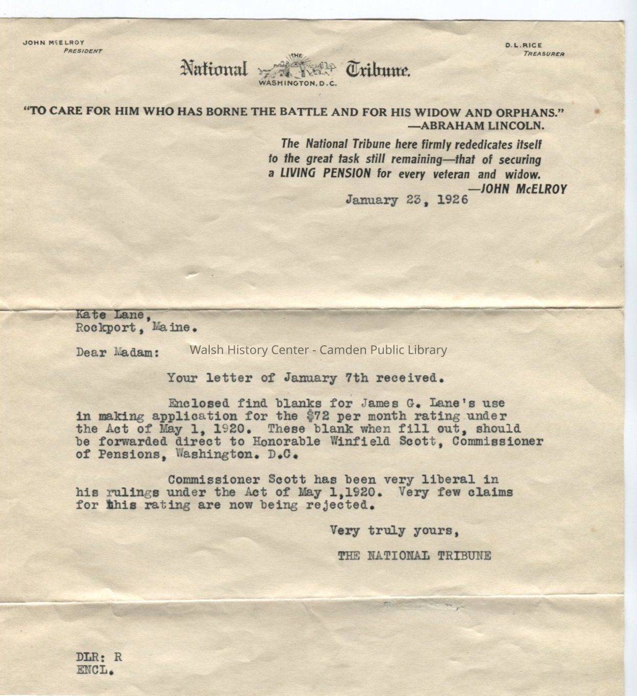 Letter to Kate Lane (wife of James Lane) of Rockport, Maine from the National Tribune in Washington, DC. The letter directs Mrs. Lane in making application to Winfield Scott, Commissioner of Pensions for a pension increase to $72 per month.Collection