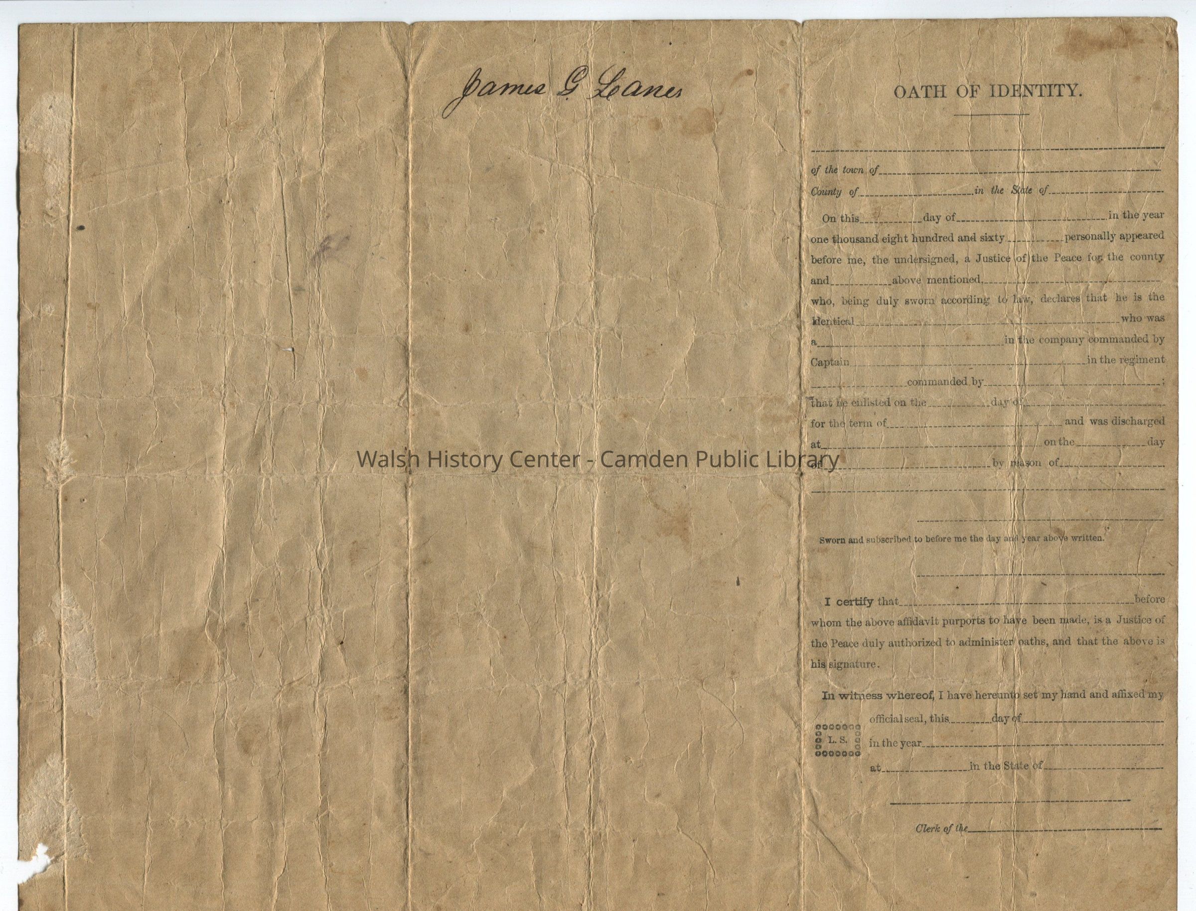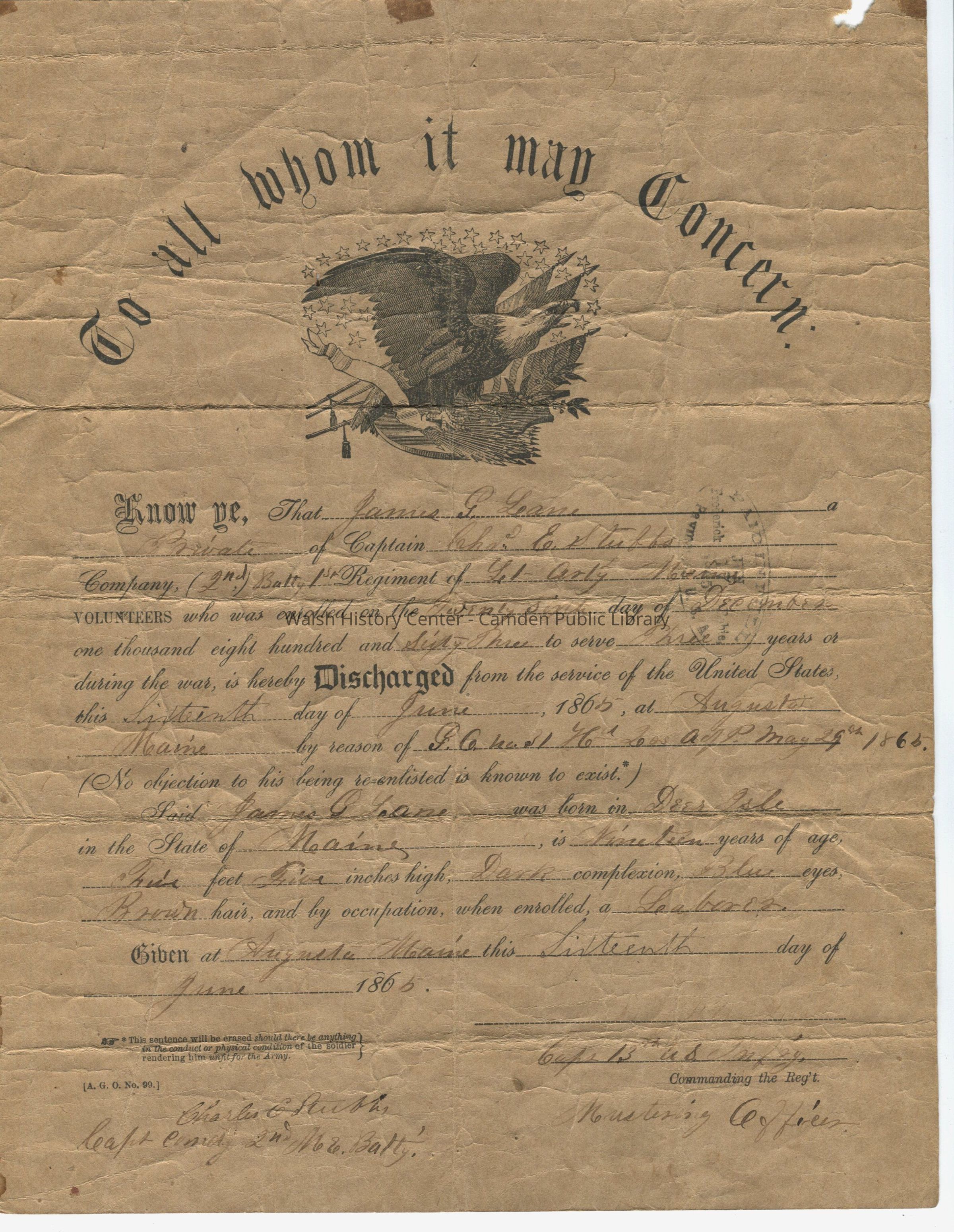 Civil War discharge certificate of James G. Lane dated 16 June 1865.Collection