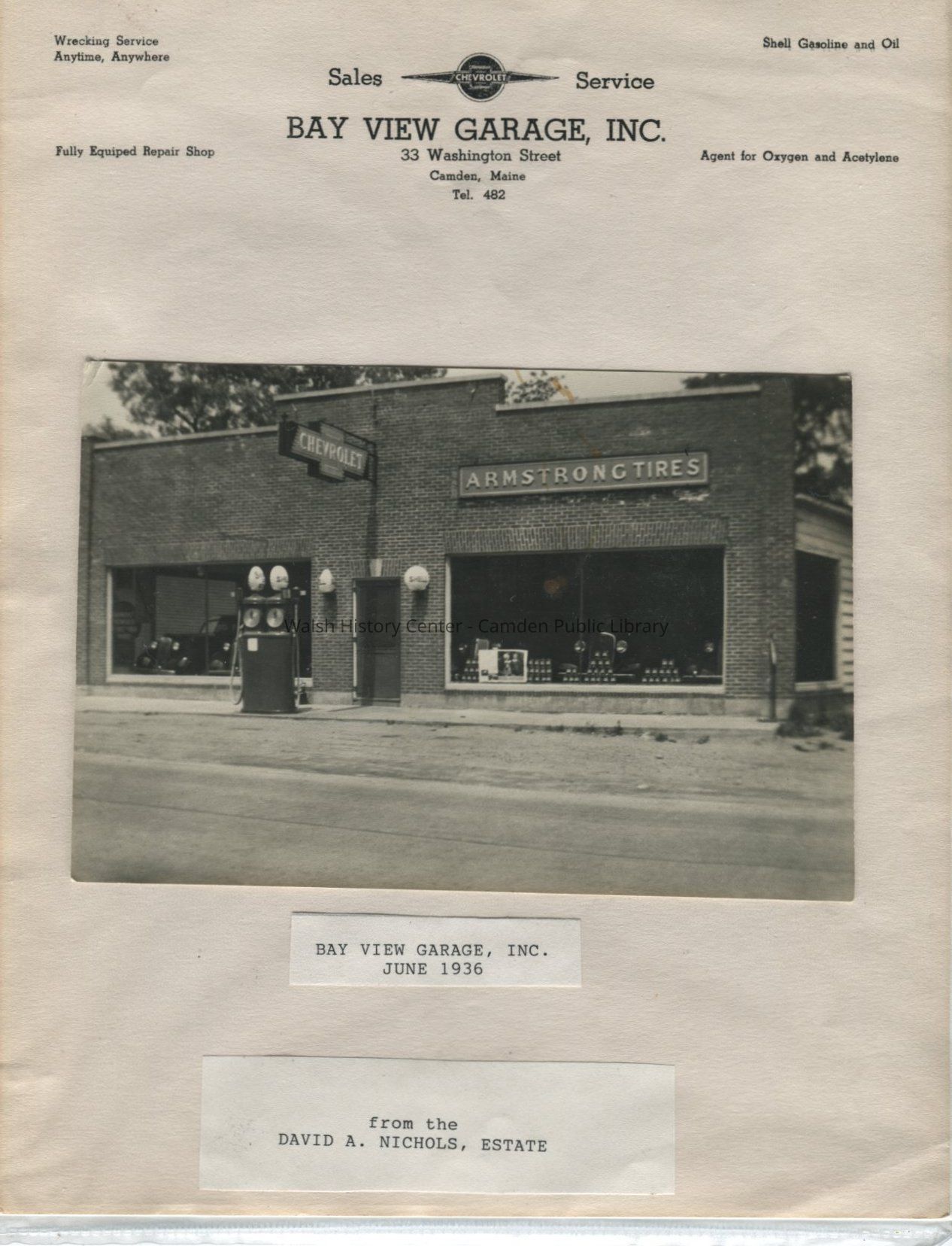 Black 3-ring binder of Bay View Garage photos and ephemera given by the late Judge David Nichols. Also includes 1 photo of Camden harbor viewed from the lime kiln on Bayview Street, and 1 photo of the Holly M. Bean shipyard circa 1905.Collection