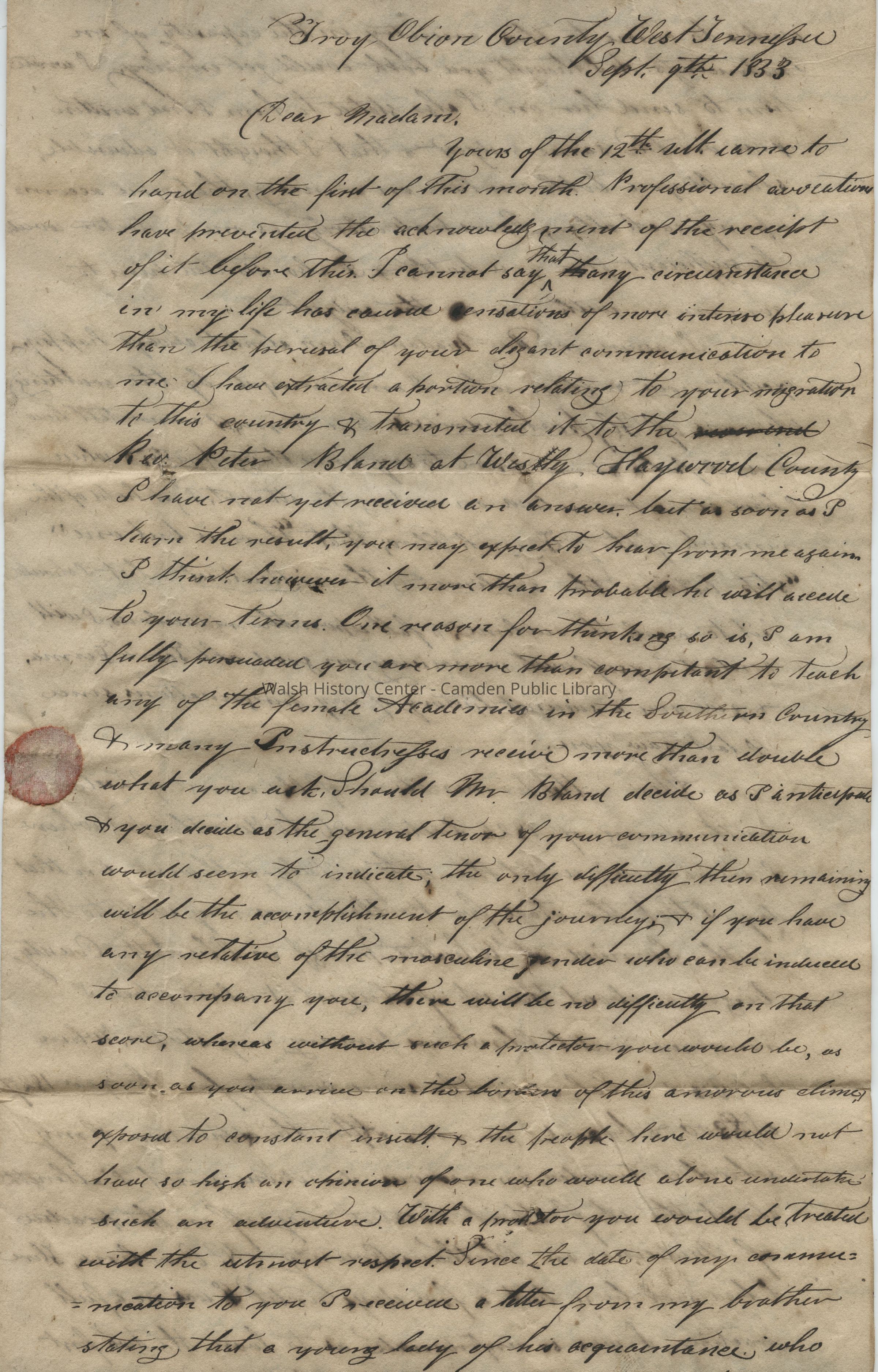 The first letter, dated 1833, is from George W. Wood in Troy, Tennessee, addressed to Abigail Talbot in Turner, Maine. The letter discusses Talbot's intention to move to that area, likely to teach.