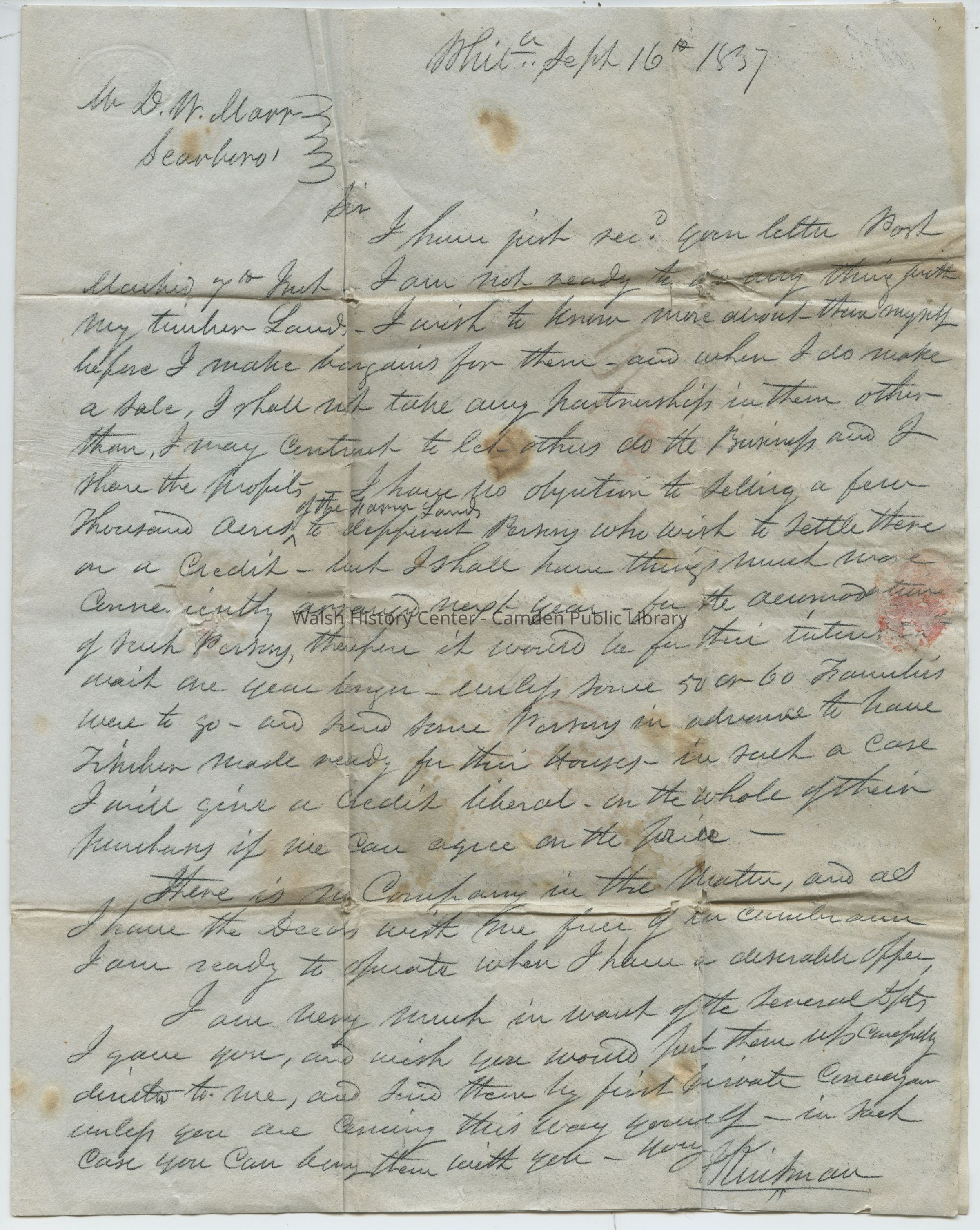 The second letter was re-used several times, originally addressed to D.W. Mann in Portland, Maine, about the sale of land, and then Mann used it to send a note to David Talbot of Turner, Maine (1837).
