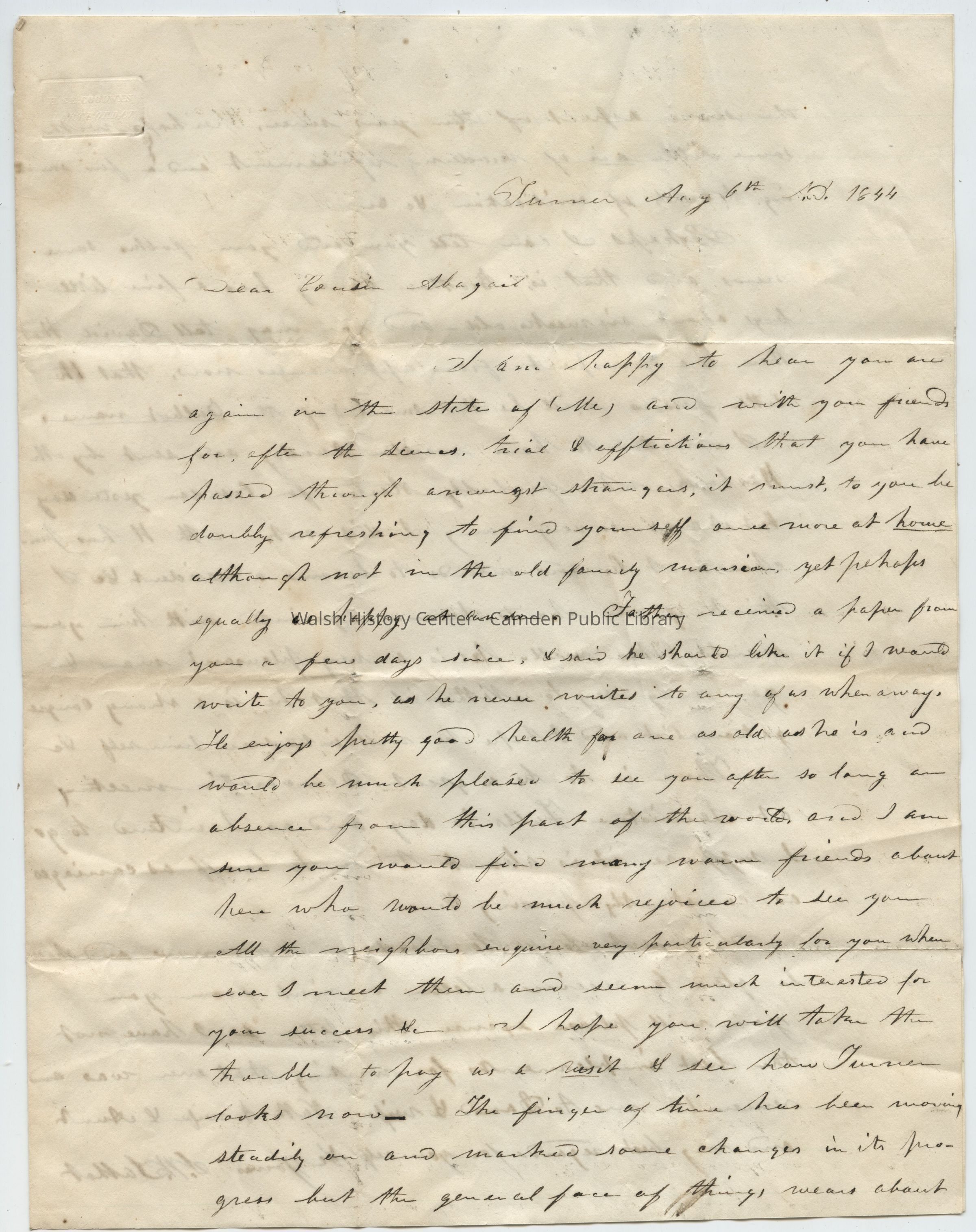 The fourth letter is addressed to "Cousin Abigail" in Goose River, Camden, Maine, in 1844, from [I.W.? Talbot] in Turner, Maine. This letter mentions that Abigail has recently moved back to Maine, and mentions a few other names, including David, Nathaniel, and Emery.