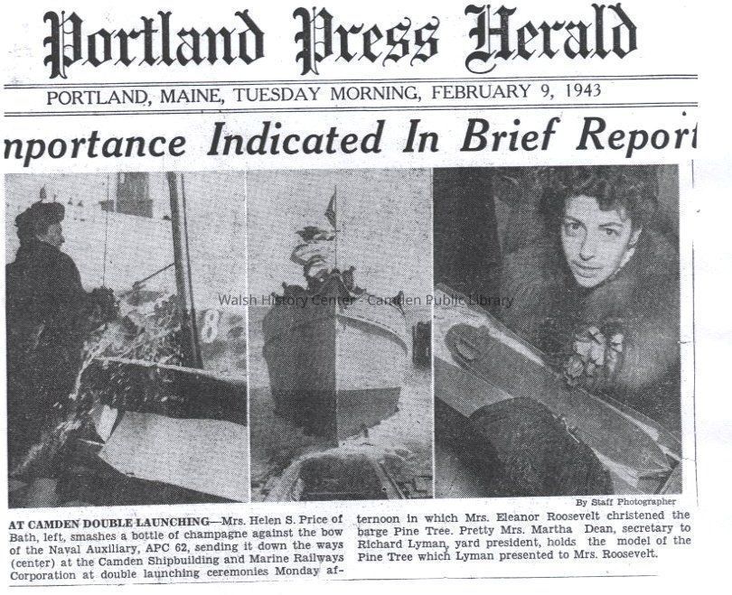 Newspaper clipping from the Portland Press Herald, February 9, 1943 with photos of the double launching of the APC 62 and the Pine Tree at the Camden shipyard.Collection