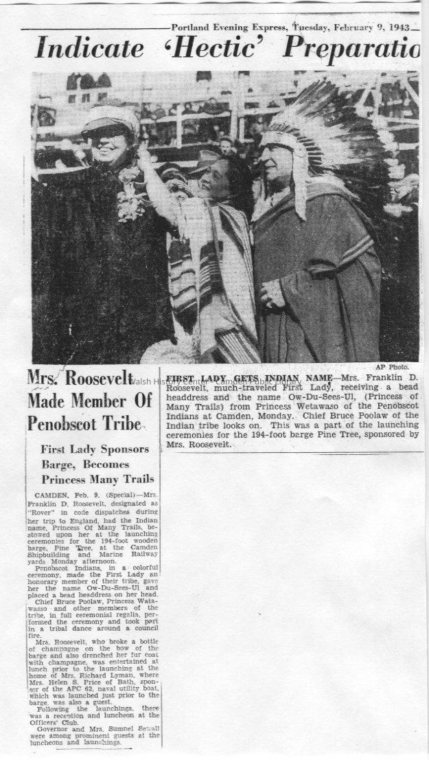 Newspaper clipping from the Portland Evening Express, February 9, 1943 with photo of Mrs. Eleanor Roosevelt receiving a bead headdress and the name Ow-Du-Sees-Ul (Princess of Many Trails) from Chief Bruce Poolaw and Princess Wetawaso of the Penobscot tribe. Mrs. Roosevelt and the tribe were part of the launching ceremony of the wooden barge "Pine Tree" at the Camden shipyard.Collection