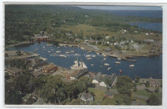 Color postcard of aerial view of Camden, Maine, showing the harbor and part of Sherman's Point as well as the Public Landing, Camden Yacht Club, and two schooners.Collection