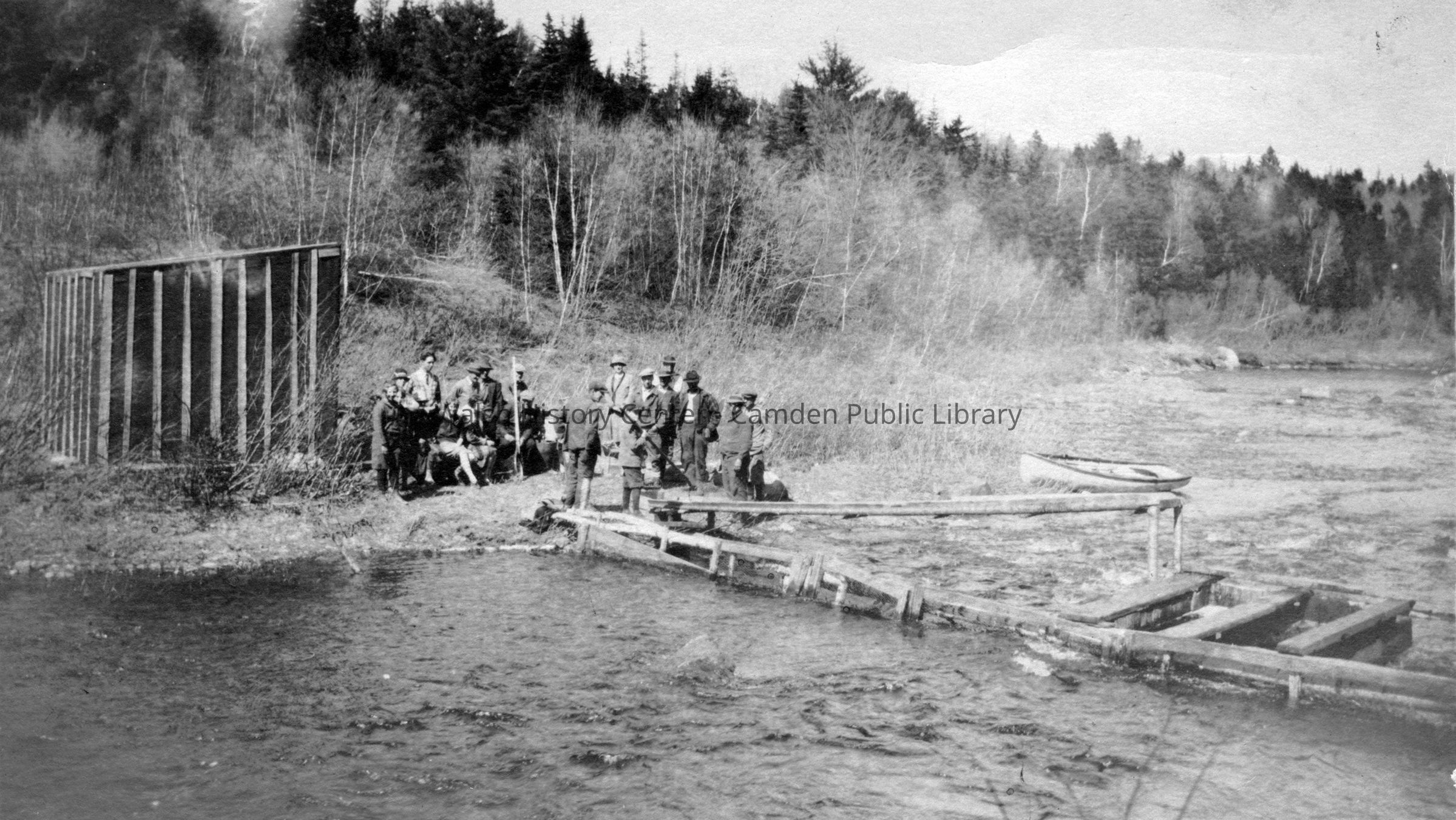Photograph (b/w) of alewive run on ducktrap stream, 1928. On back of photo is handwritten: "Alewife run on Ducktrap Stream, 1928. Irv Eugley paid $50 for elwive privelege according to the 1929 Lincolnville Town report. Fred Hardy & Russell Heal." In spring, when the ice is out of the feeder ponds, the alewives run the streams. Gulls flying over Ducktrap Falls is a signal. Others involved with the harvest from 1926 to 1935 were Fred Young, W. J. Morrison, Fred Amborn, and Arthur Oxton. Most years the fee was $50 to the Town.Collection