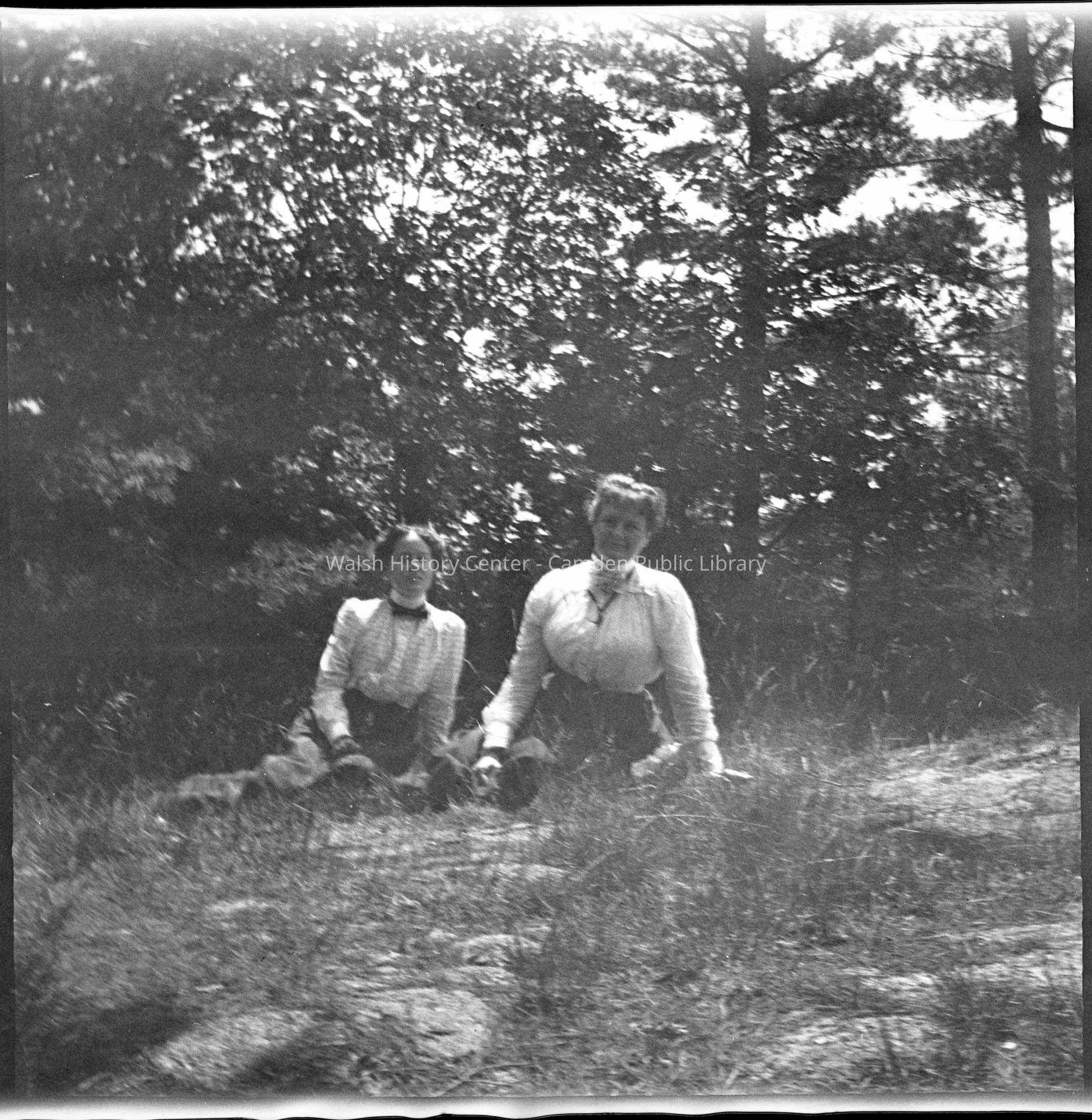 B/W photograph of Alice Merriam (at left) with Bess ? at Ballard Park in July 1899.Collection
