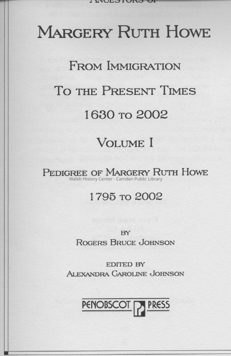 Ancestors of Margery Ruth Howe From Immigration To the Present Times 1630 to 2002. Volume I. Pedigree of Margery Ruth Howe 1795 to 2002Entry/Object ID