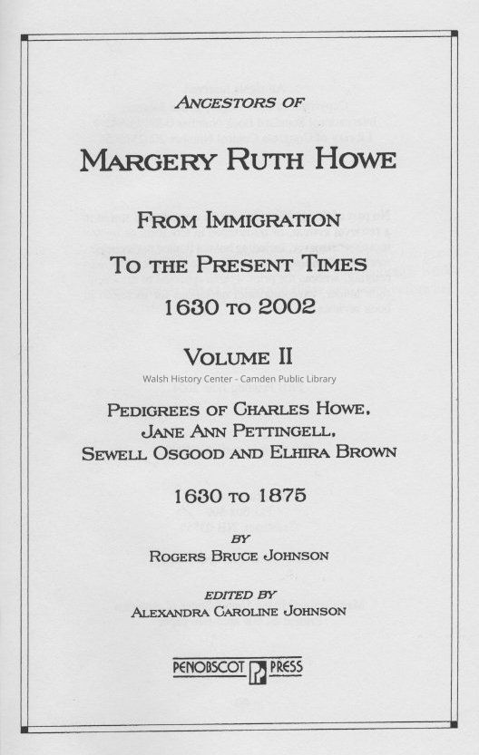 Ancestors of Margery Ruth Howe from immigration to the present times 1630 to 2002. Volume II. Pedigrees of Charles Howe, Jane Ann Pettingell, Sewell Osgood and Elhira Brown.