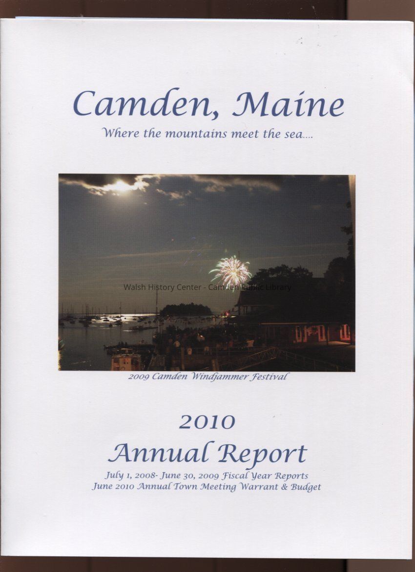 Annual report for the town of Camden, Maine. Includes July 1, 2008 - June 30, 2009 fiscal year reports and June 2010 annual town meeting warrant and budget.