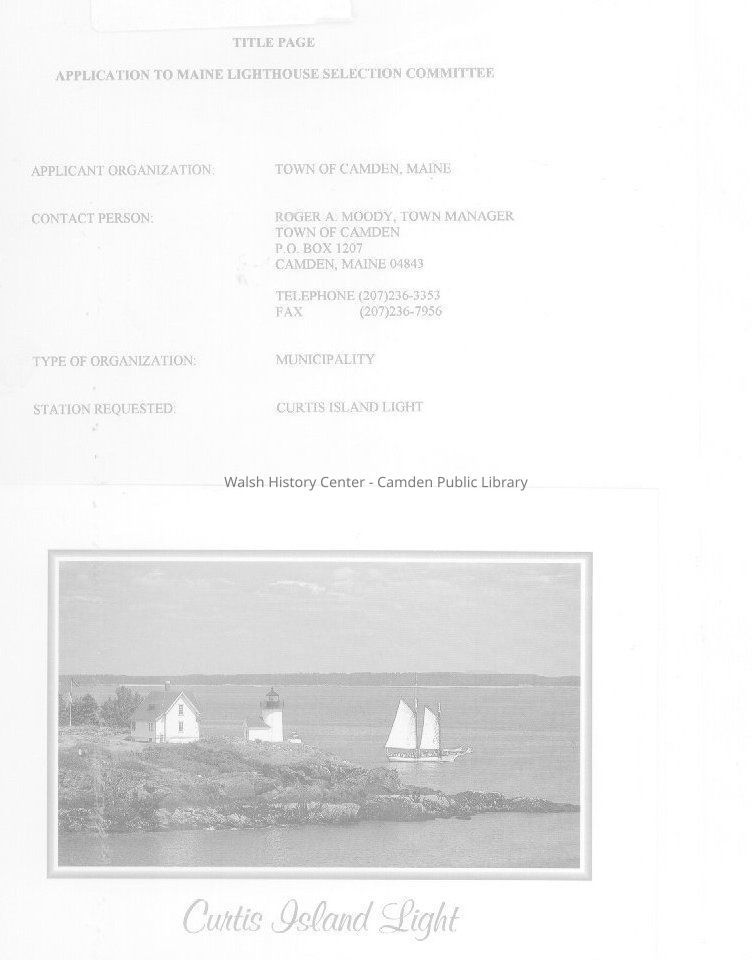 This notebook contains a copy of the application of the Town of Camden to acquire Curtis Island Lighthouse. Several appendices are also included such as a description of the island's ecosystem, the history of the lighthouse and other buildings, historical photographs and caretaker reports. There is an appendix index under tab #1.