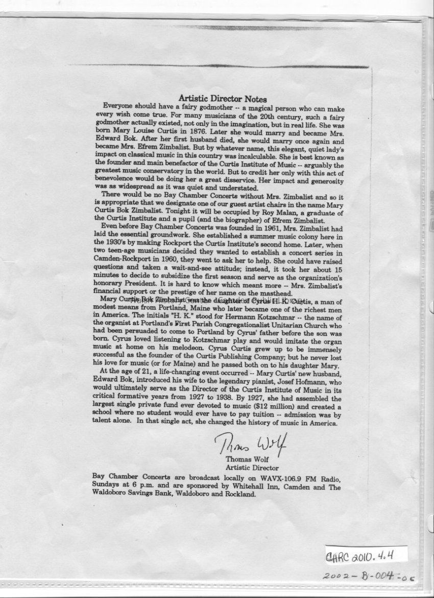 Photocopy of Bay Chamber Concerts tribute to Mary Louise Curtis Bok describing her contributions to music education. Article was written by BCC Artistic Director Thomas Wolf.Collection