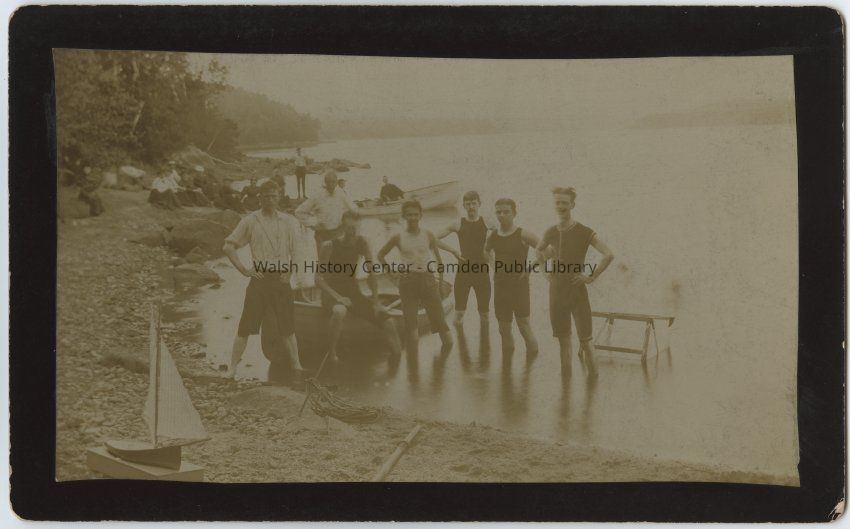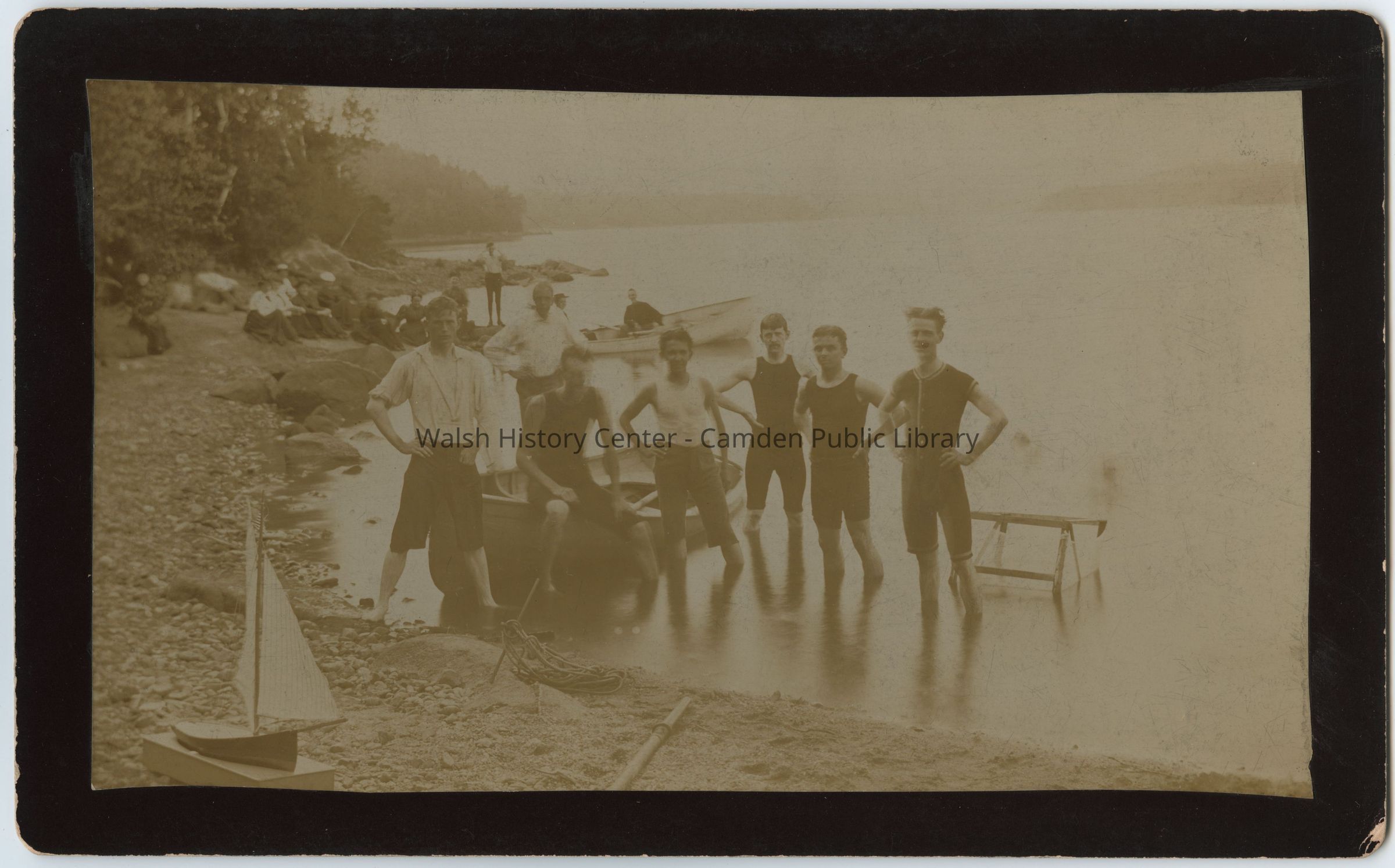 Photograph of several young men in the foreground standing in the water near a rowboat and a toy sailboat. There are several women seated on the ledges in the background. Location in the photograph is not identified, but could be Megunticook Lake.Photograph Details