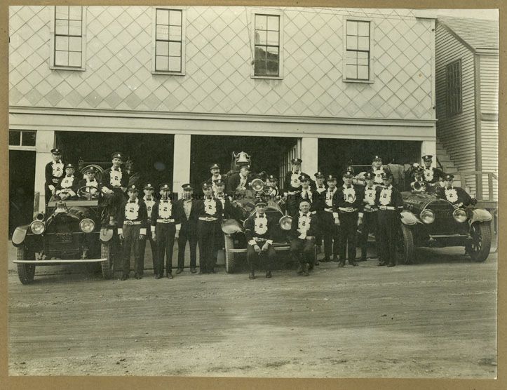 Posing in front of the Washington Street fire house, with three FD Camden motorcars.