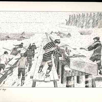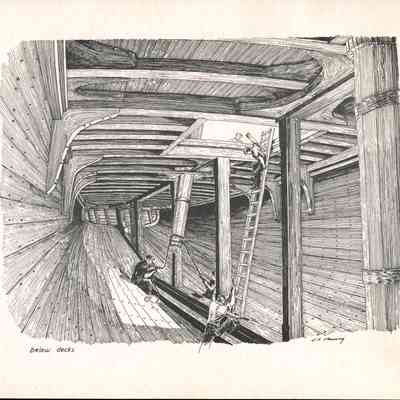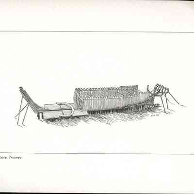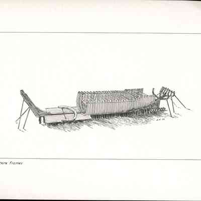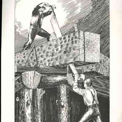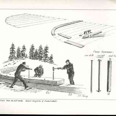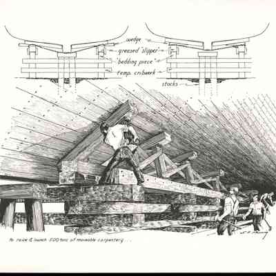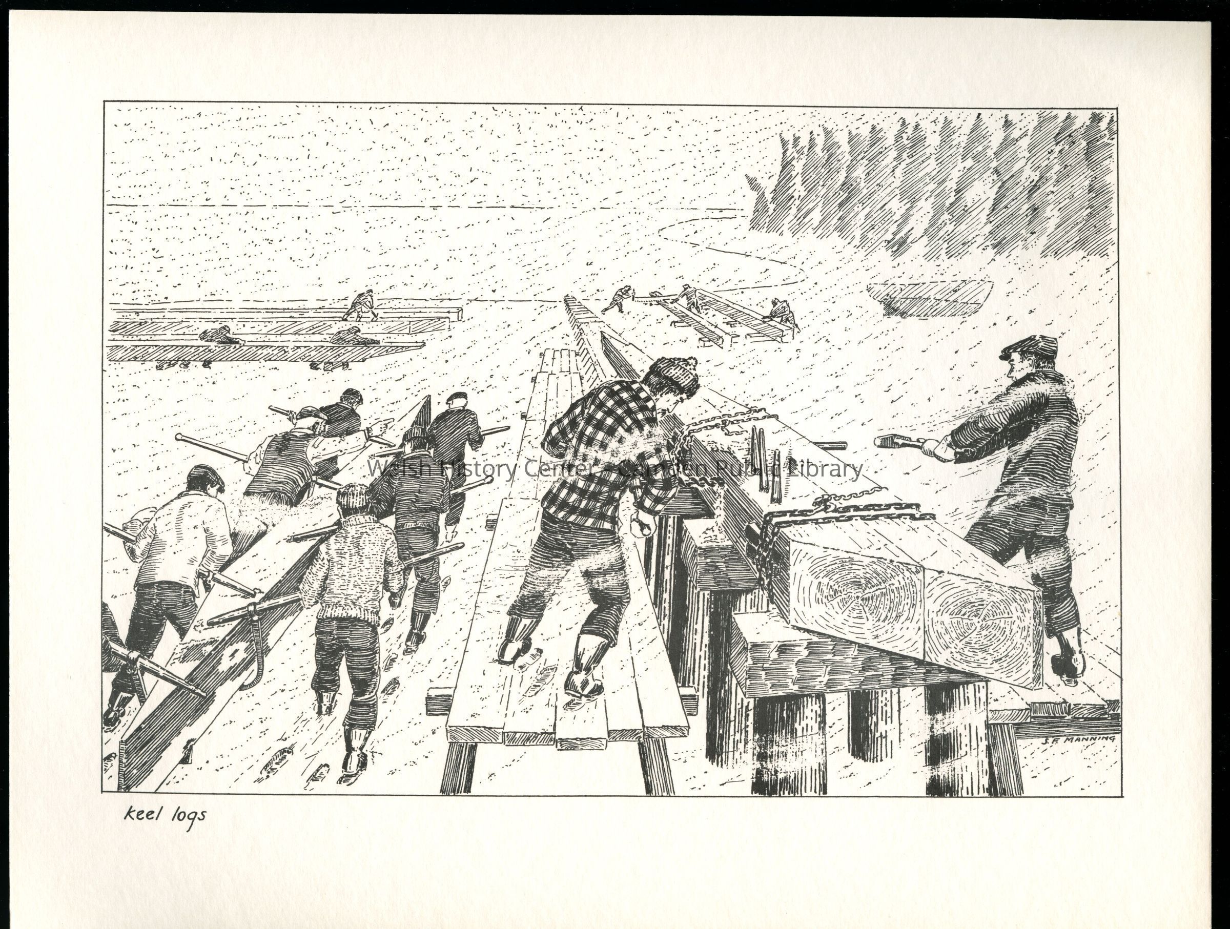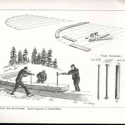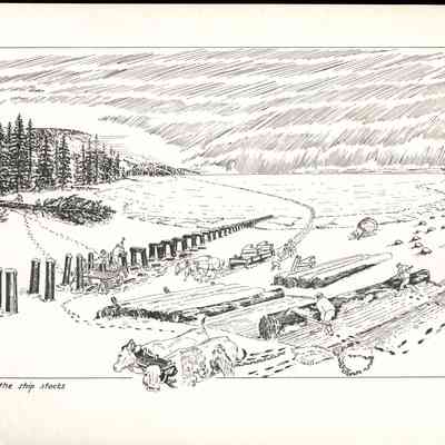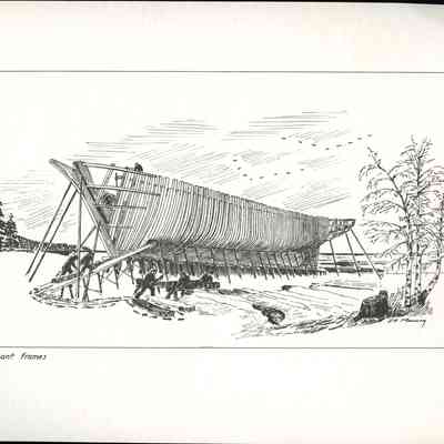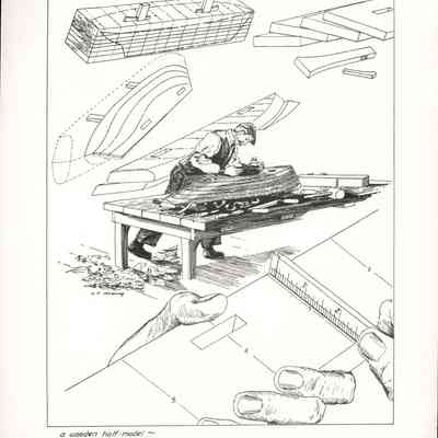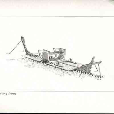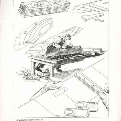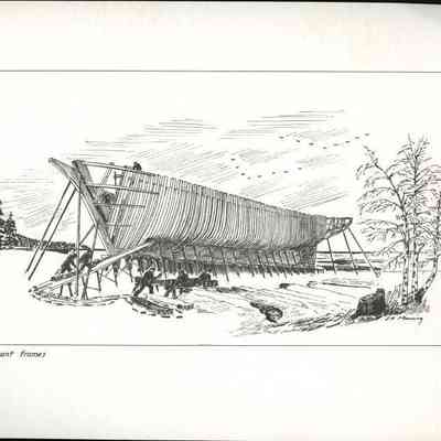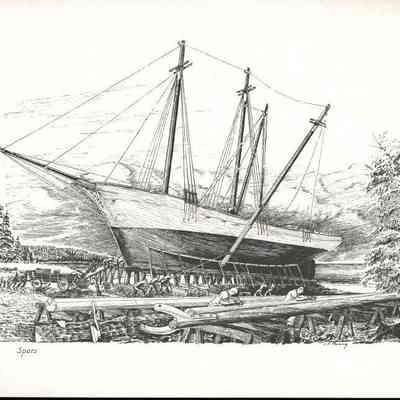 Set of loose 12 pen and ink drawings of the stages of construction of a schooner on the Maine coast by marine illustrator Samuel F. Manning. Each print is 8 1/2" x 11" on ivory cover stock.Collection
