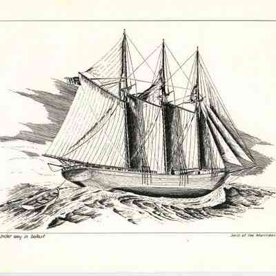 Pen and ink drawing of a schooner under sail titled "Under Way in Ballast" by marine illustrator Samuel F. Manning.Collection