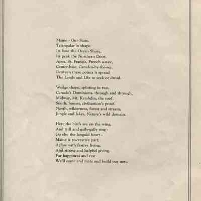One copy of the "The Maine Spirit Articulate" sheet music written by Job Herrick Montgomery and Everett Robert Grieve. Published by the Camden Publishing Company and featured over WLBZ, Bangor, Maine by John Taylor.Collection
