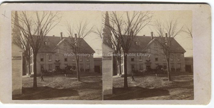 Stereo photograph of the Bay View House located at the corner of Elm and Chestnut Streets in Camden, Maine. The Chestnut Street Baptist Church is visible just behind the hotel. The corner of a building with a sign advertising "Millinery and Fancy Goods" can be seen on the left.